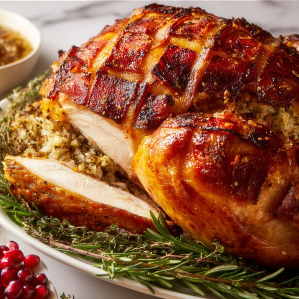 In this guide, we’ll explore the ingredients, methods, tips, and variations that ensure your Bacon Roasted Thanksgiving Turkey with Herb Stuffing becomes a holiday tradition. The final result is a turkey that’s aromatic, golden brown, and beautifully wrapped in crisp bacon — a center-of-the-table masterpiece worthy of any celebration.