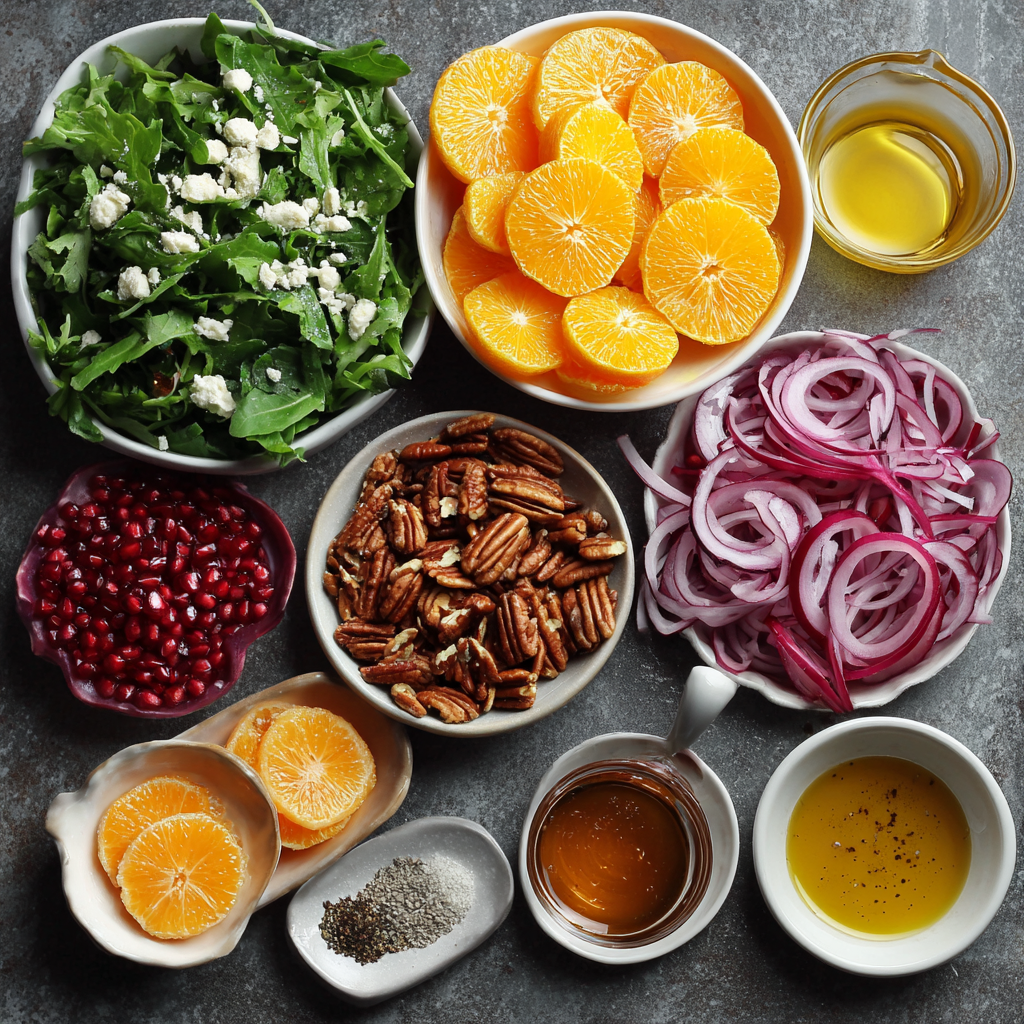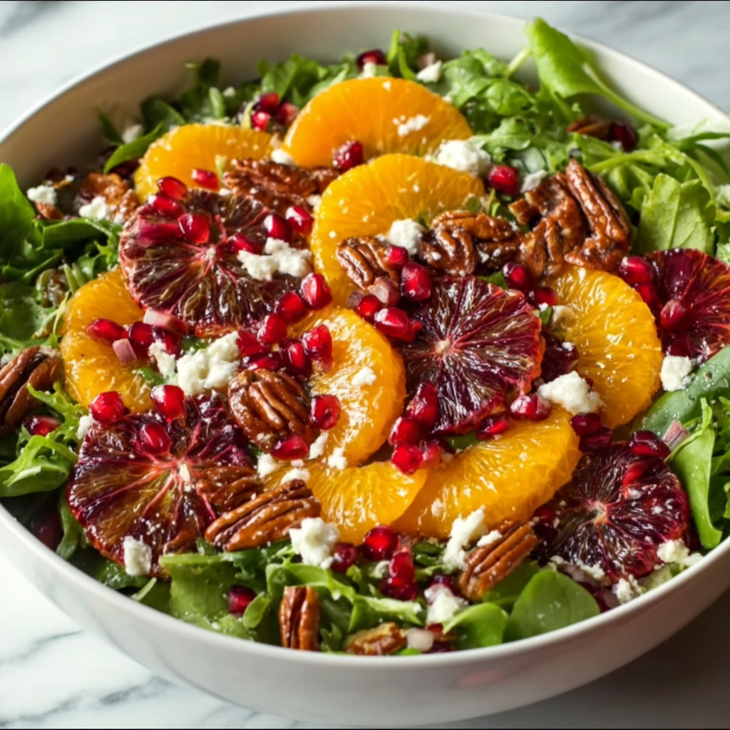 With juicy citrus slices, ruby-red pomegranate seeds, crisp greens, creamy feta, and crunchy candied pecans, this salad feels like winter sunshine in a bowl. It’s the perfect mix of sweet, tart, fresh, and savory. Drizzled with a simple homemade citrus-honey vinaigrette, it becomes a showstopping side dish that complements holiday mains like roast turkey, glazed ham, beef tenderloin, or even holiday salmon.