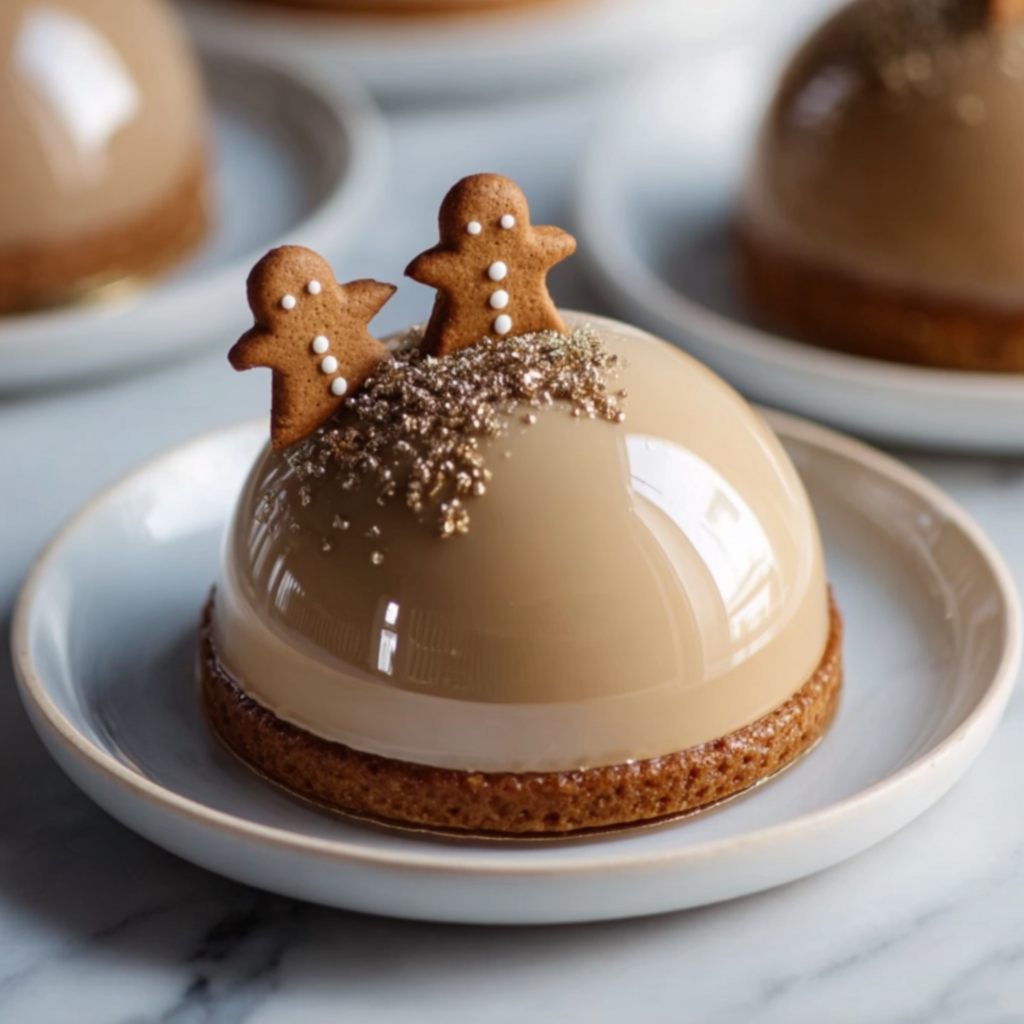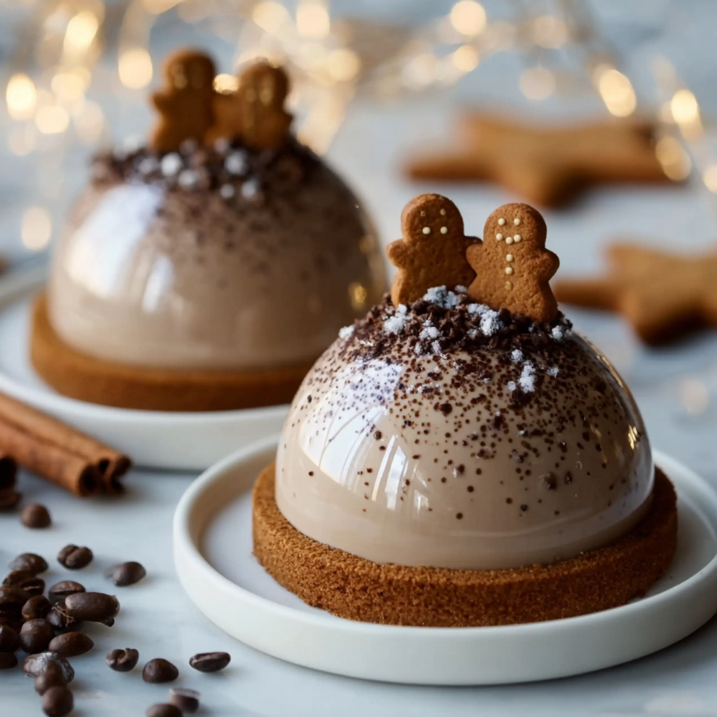 These mousse domes marry the flavors of the season — gingerbread, coffee, spices, and cream — with elegance and modern holiday presentation. The glossy exterior, the soft inside, and the warm spice aroma make them a show-stopping dessert.