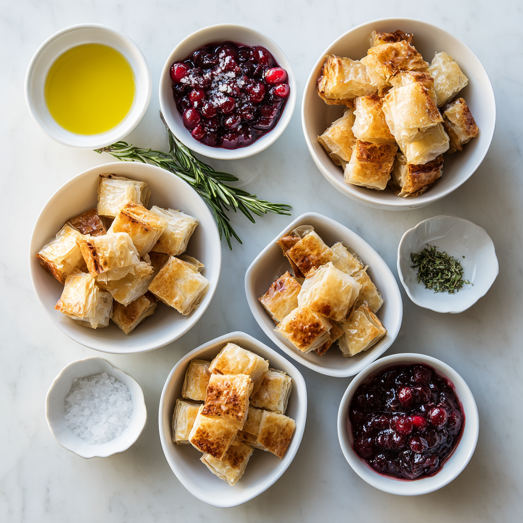 - Minimal ingredients: You only need filo, brie, cranberry sauce, butter, and optional herbs.