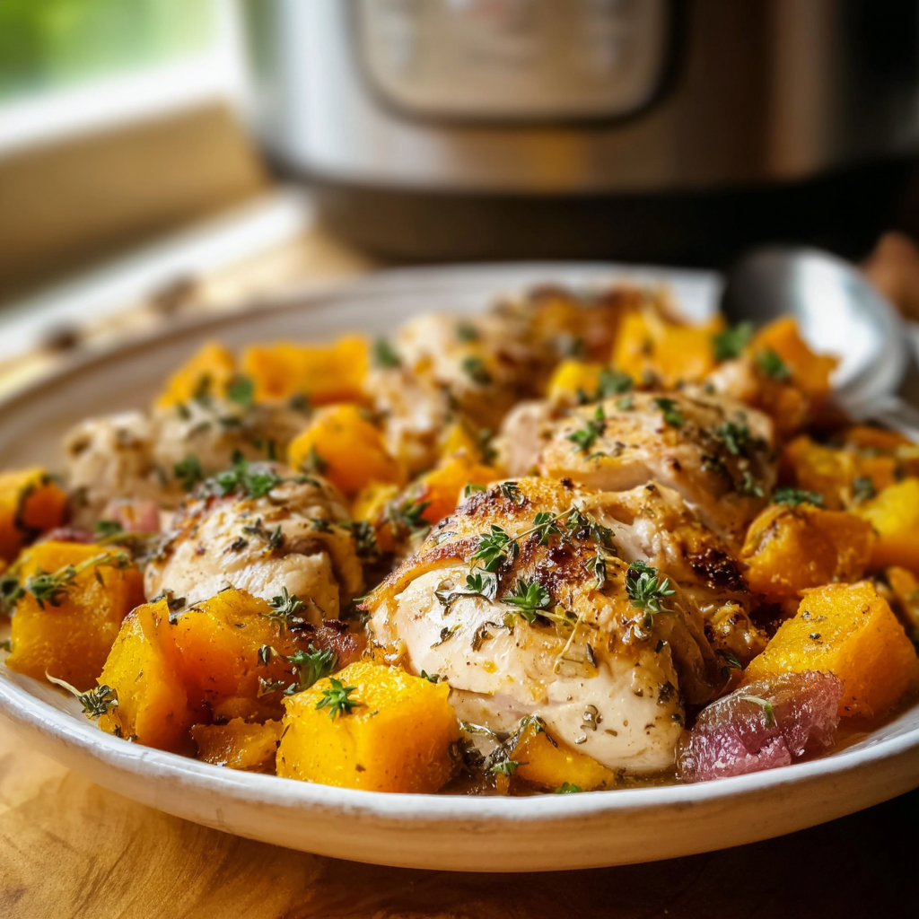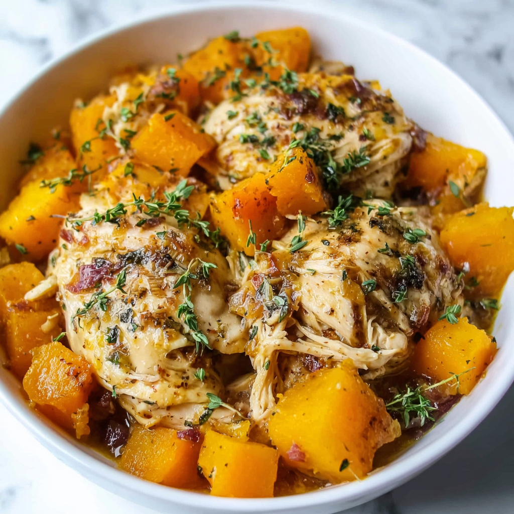 This dish is warm, comforting, and incredibly easy to make. Just add everything to your slow cooker, turn it on, and come back to tender, juicy chicken surrounded by melt-in-your-mouth squash and a silky maple-dijon sauce. It’s the ideal weeknight dinner, meal-prep recipe, or “set-and-forget” fall comfort food.
