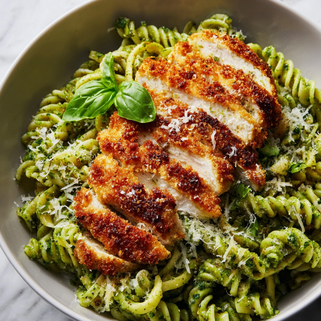 If you love simple meals that taste like restaurant-quality comfort food, this Pesto Pasta with Crispy Parmesan Chicken will become your new favorite dinner. It’s the perfect balance of flavors and textures—tender pasta coated in creamy basil pesto, topped with juicy pan-fried chicken covered in a golden, crunchy parmesan crust.