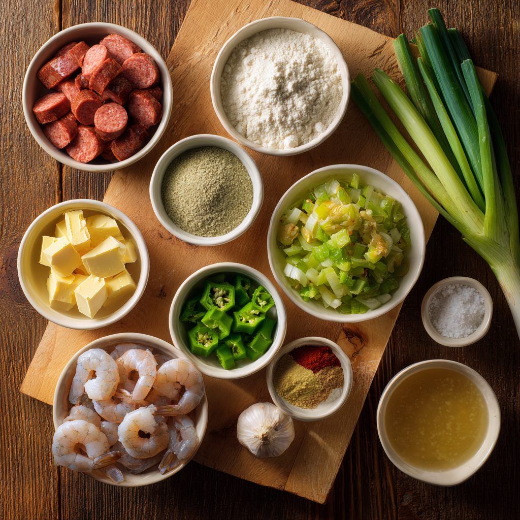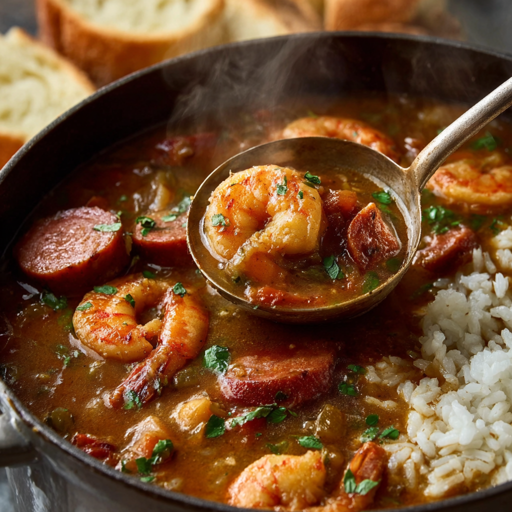 Gumbo is more than a recipe; it’s tradition. It’s a blend of African, French, Spanish, and Native American influences, all simmered together to create one unforgettable dish. A proper gumbo starts with a roux—slowly browned flour and fat that develops deep, nutty color and flavor. From there, the “holy trinity” of Cajun cooking—onions, celery, and bell pepper—adds savory aroma and structure. And of course, smoked andouille sausage and sweet Gulf shrimp create the iconic surf-and-turf flavor that makes gumbo so beloved.
