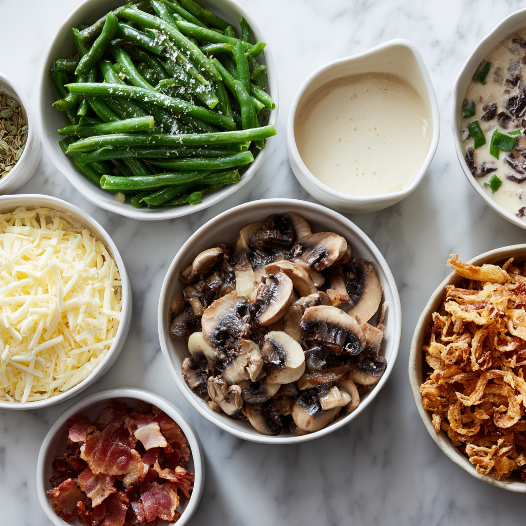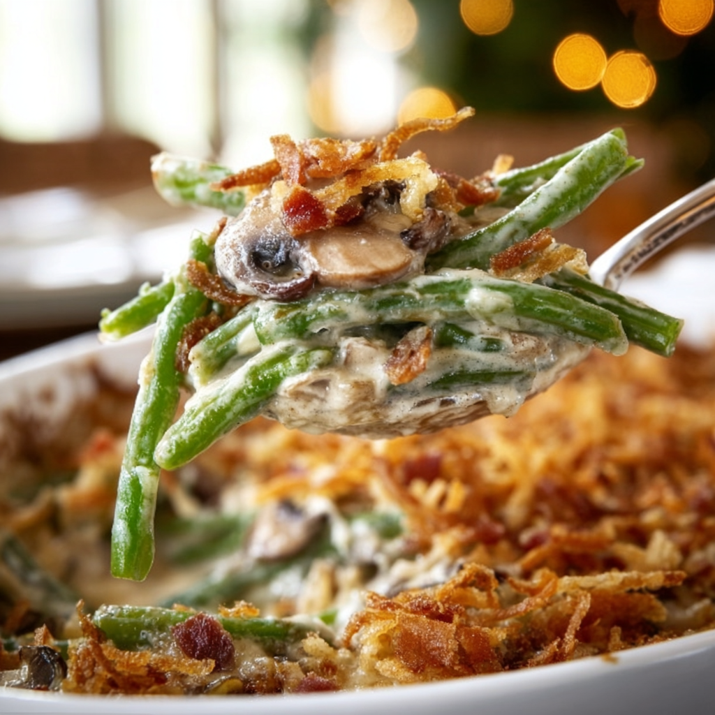 When it comes to iconic holiday side dishes, few recipes are more beloved than a classic green bean casserole. Creamy, savory, cozy, and crowned with those irresistible crispy fried onions—it’s the dish many people look forward to most at Thanksgiving and Christmas dinner. But today’s recipe levels up the traditional favorite with the addition of smoky bacon and sautéed mushrooms, making every bite richer, deeper in flavor, and completely unforgettable.