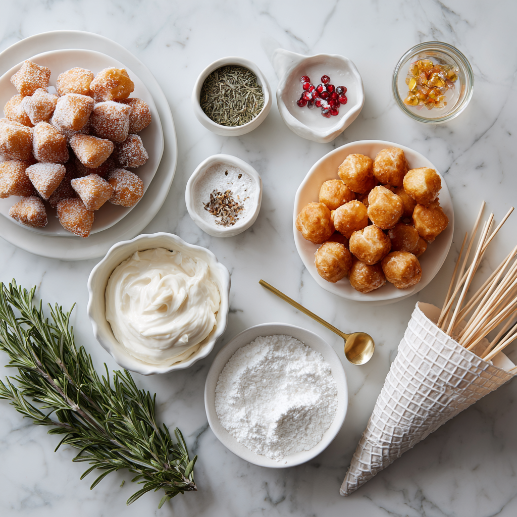 Tuck small rosemary sprigs between donut holes for a pine-tree effect. Insert cranberries or edible decorations for color. - Dust with “snow.”