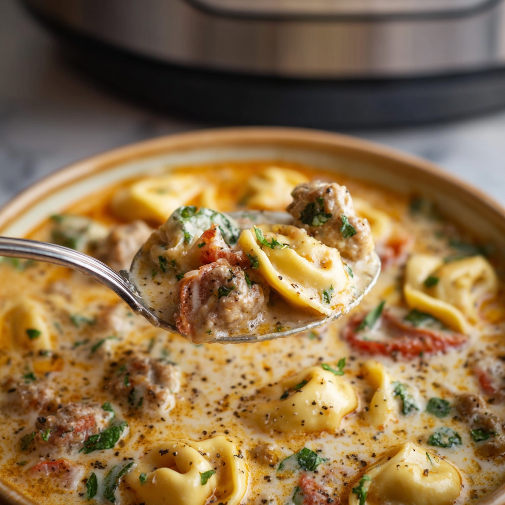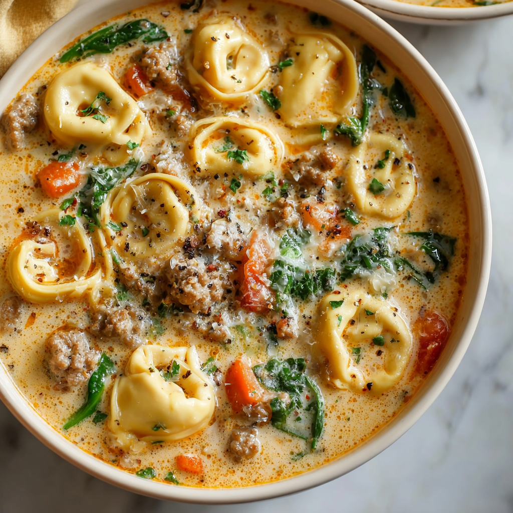 This soup brings together three stars: tender cheese-filled tortellini, flavorful Italian sausage, and a luxuriously creamy broth. Toss in fresh spinach, diced carrots, sautéed onions, and garlic, and you have the kind of soup that feels like a hug from the inside out.