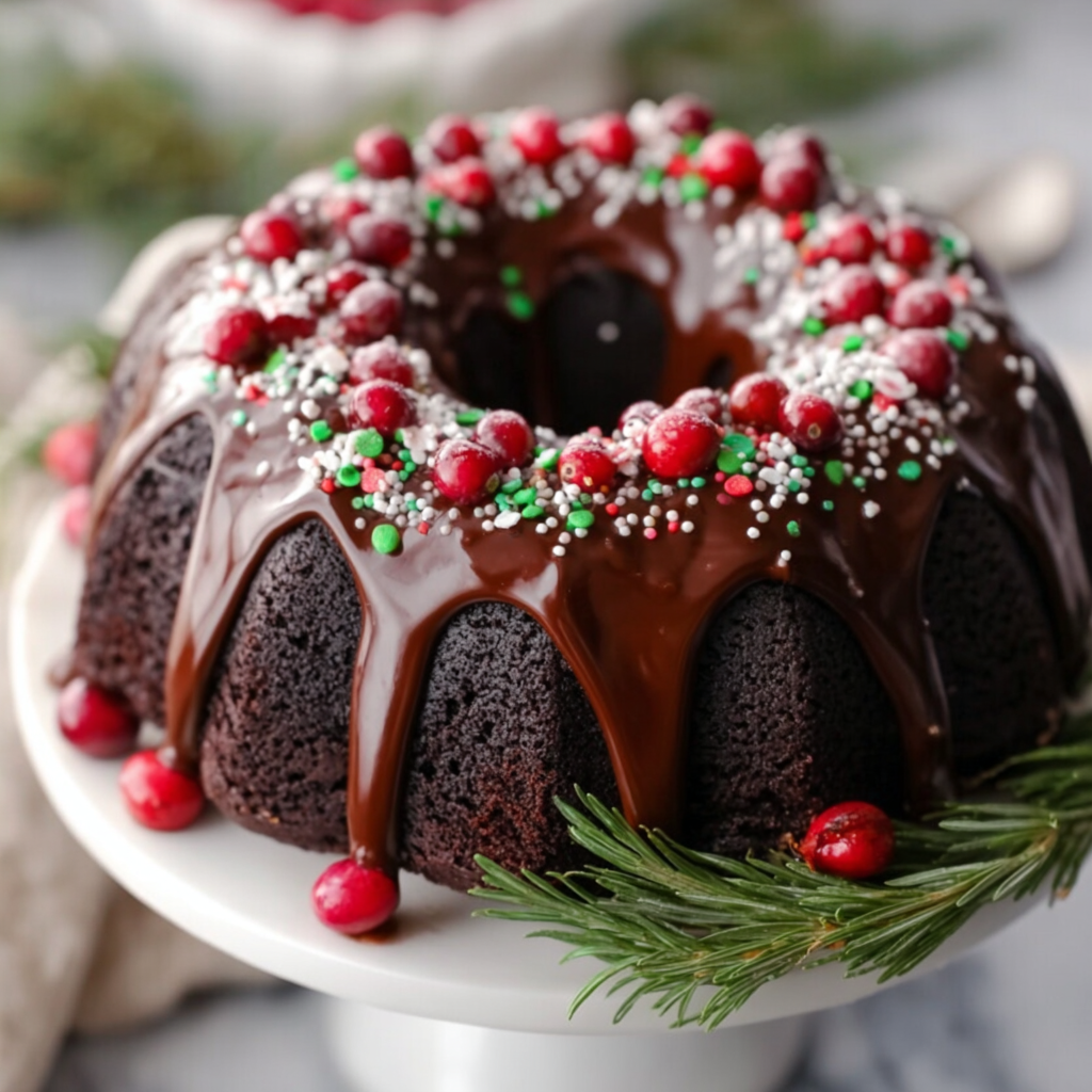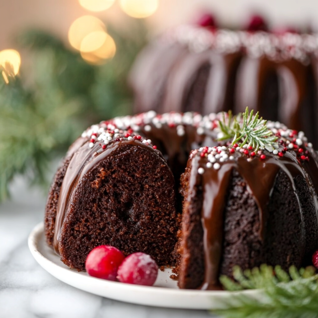 A rich and moist holiday bundt cake combining gingerbread spices with deep chocolate flavor, topped with a glossy festive chocolate glaze.