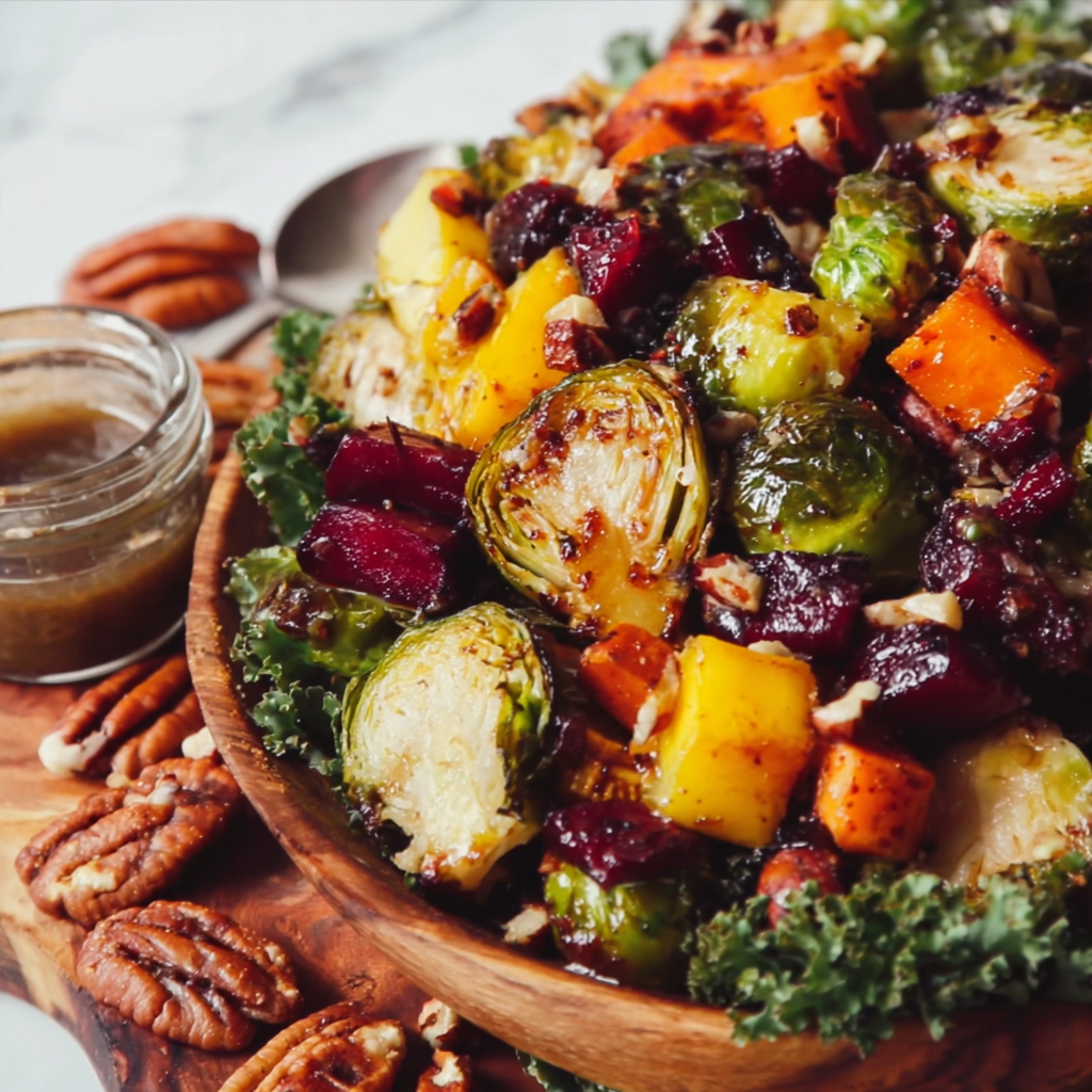 If you’re craving a warm, hearty salad that captures the flavors of fall, this Roasted Brussels Sprouts and Butternut Squash Salad with Pecans is exactly what you’re looking for. It’s vibrant, cozy, nutritious, and loaded with textures—crispy Brussels sprouts, tender caramelized squash, crunchy toasted pecans, and chewy dried cranberries. A maple Dijon vinaigrette ties everything together with sweet, tangy perfection.