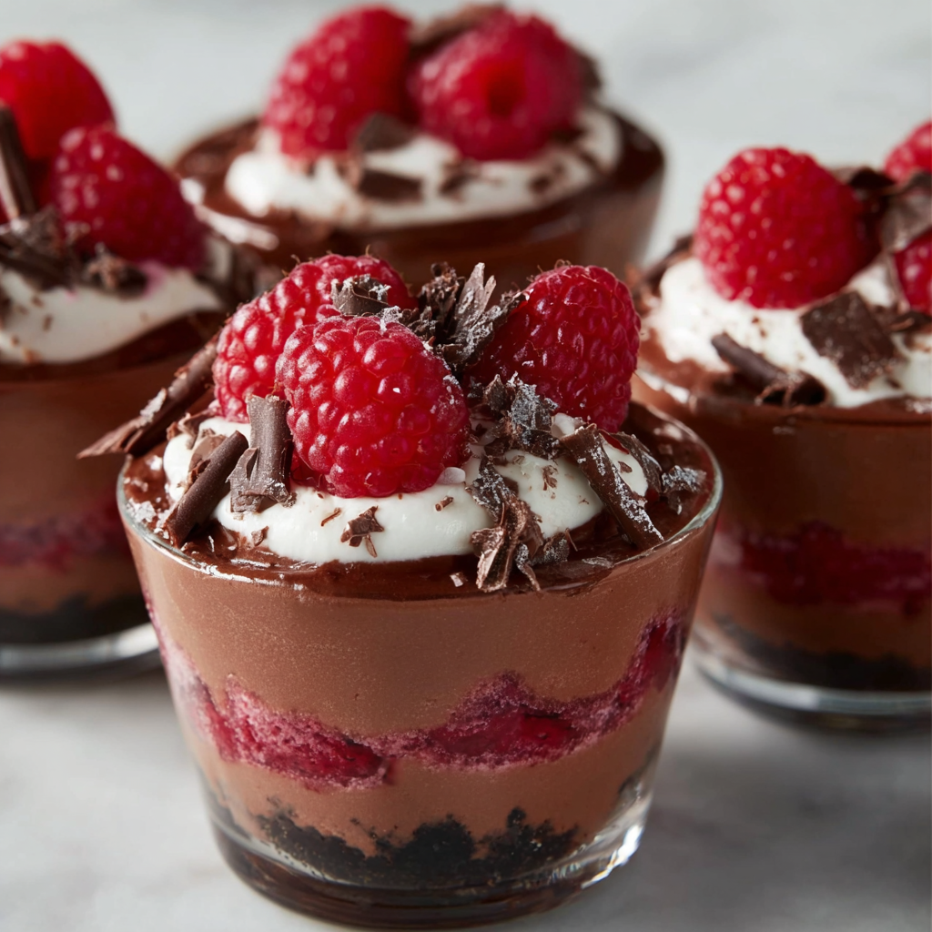 - Spoon chocolate mousse into serving cups, add a raspberry layer, then repeat if desired.