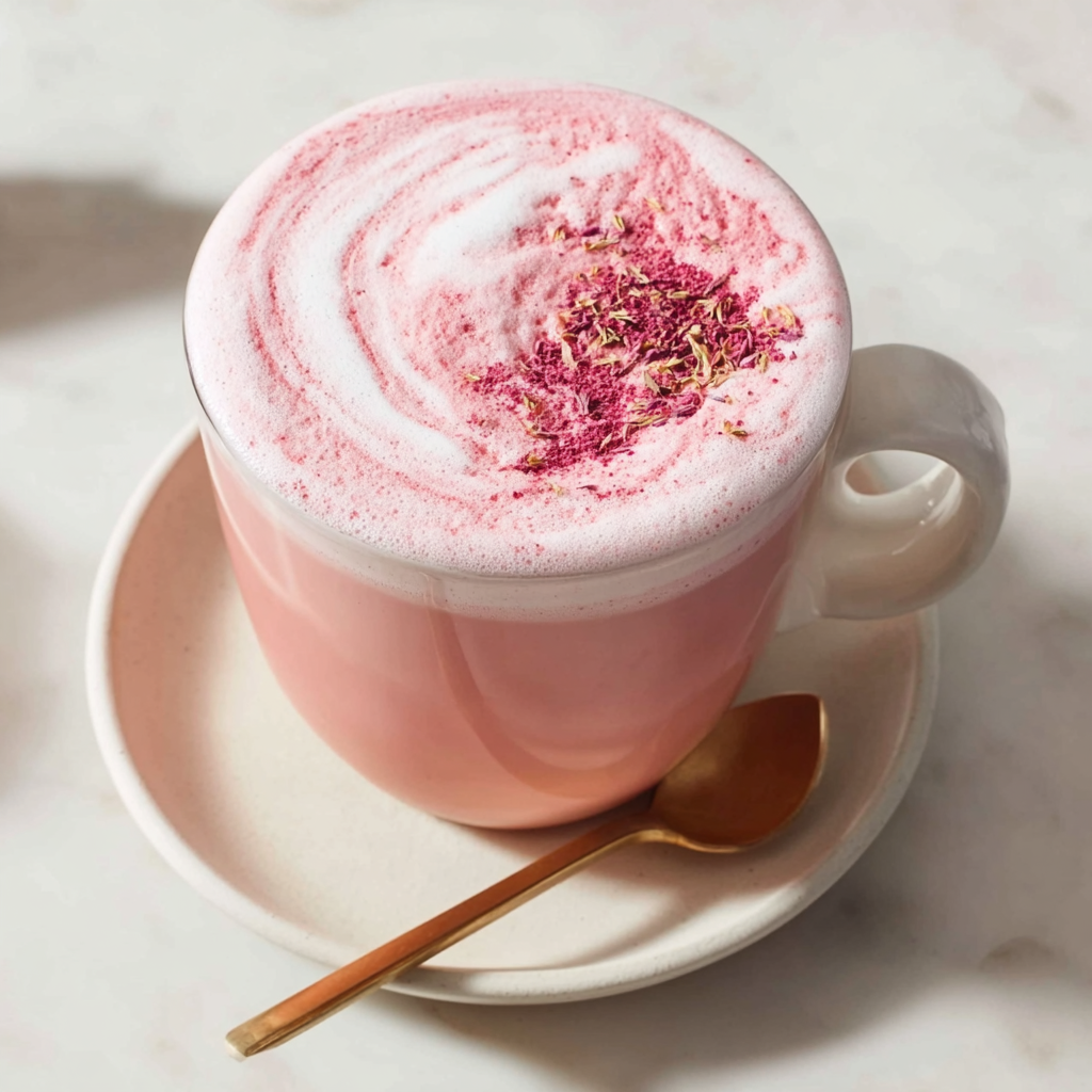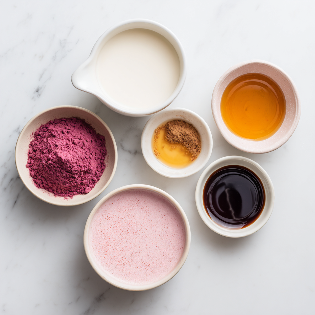 The signature blush color comes from beetroot powder. Don’t worry — it doesn’t taste like raw beets. When paired with milk, vanilla, and a touch of sweetener, beetroot powder adds a mild earthiness and stunning color without overpowering the drink.