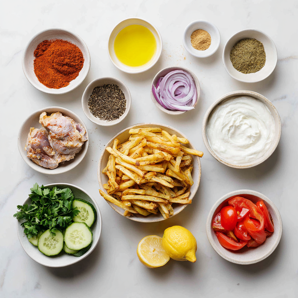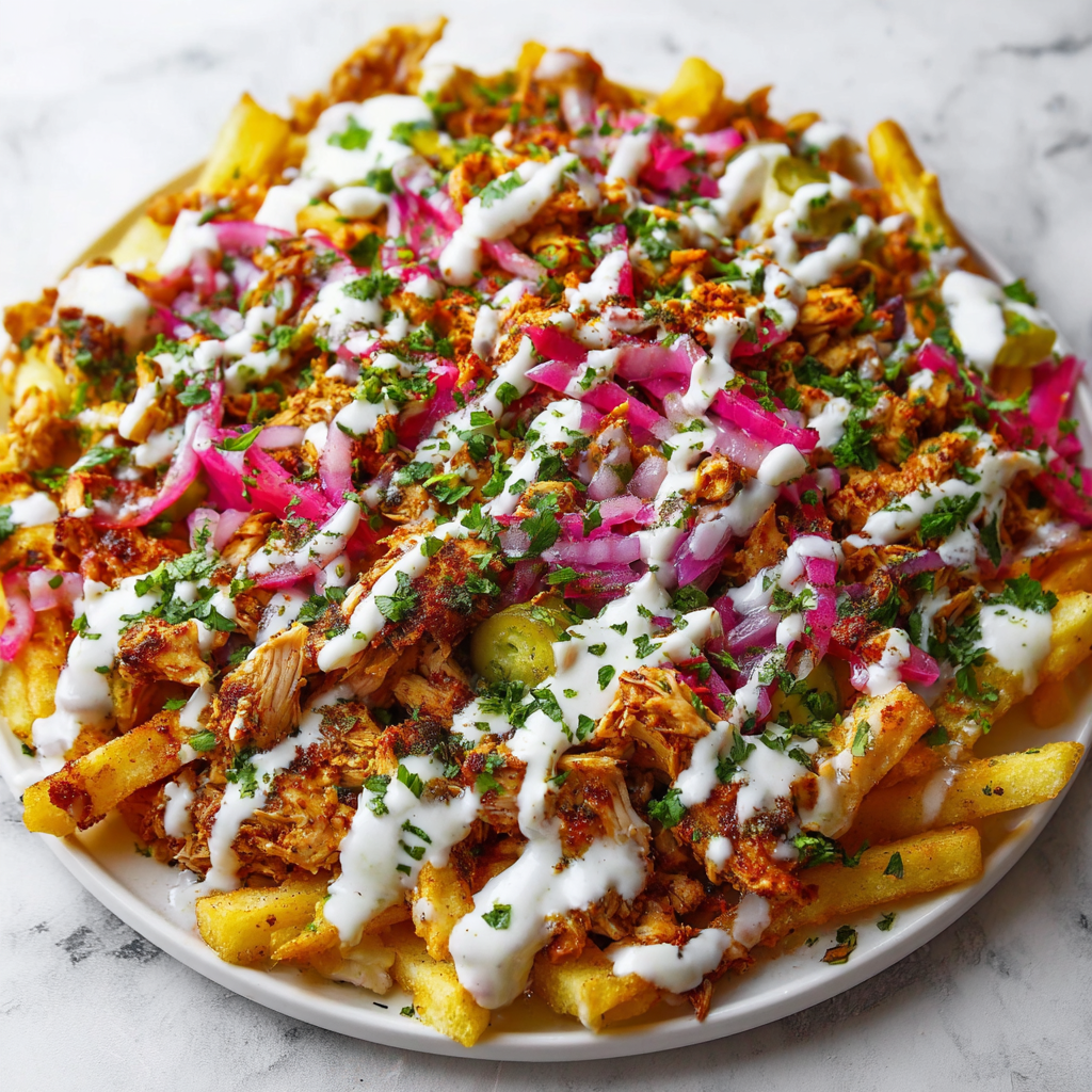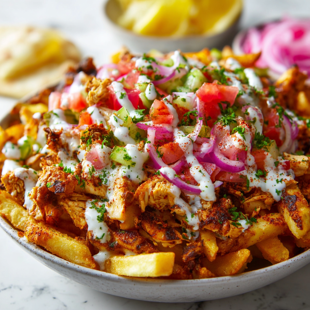 Shawarma chicken is deeply seasoned with warm spices like cumin, paprika, and garlic, giving it a savory richness that pairs beautifully with crispy fries. Add cool yogurt sauce, tangy pickles, and fresh herbs, and you get the perfect balance of textures and flavors.