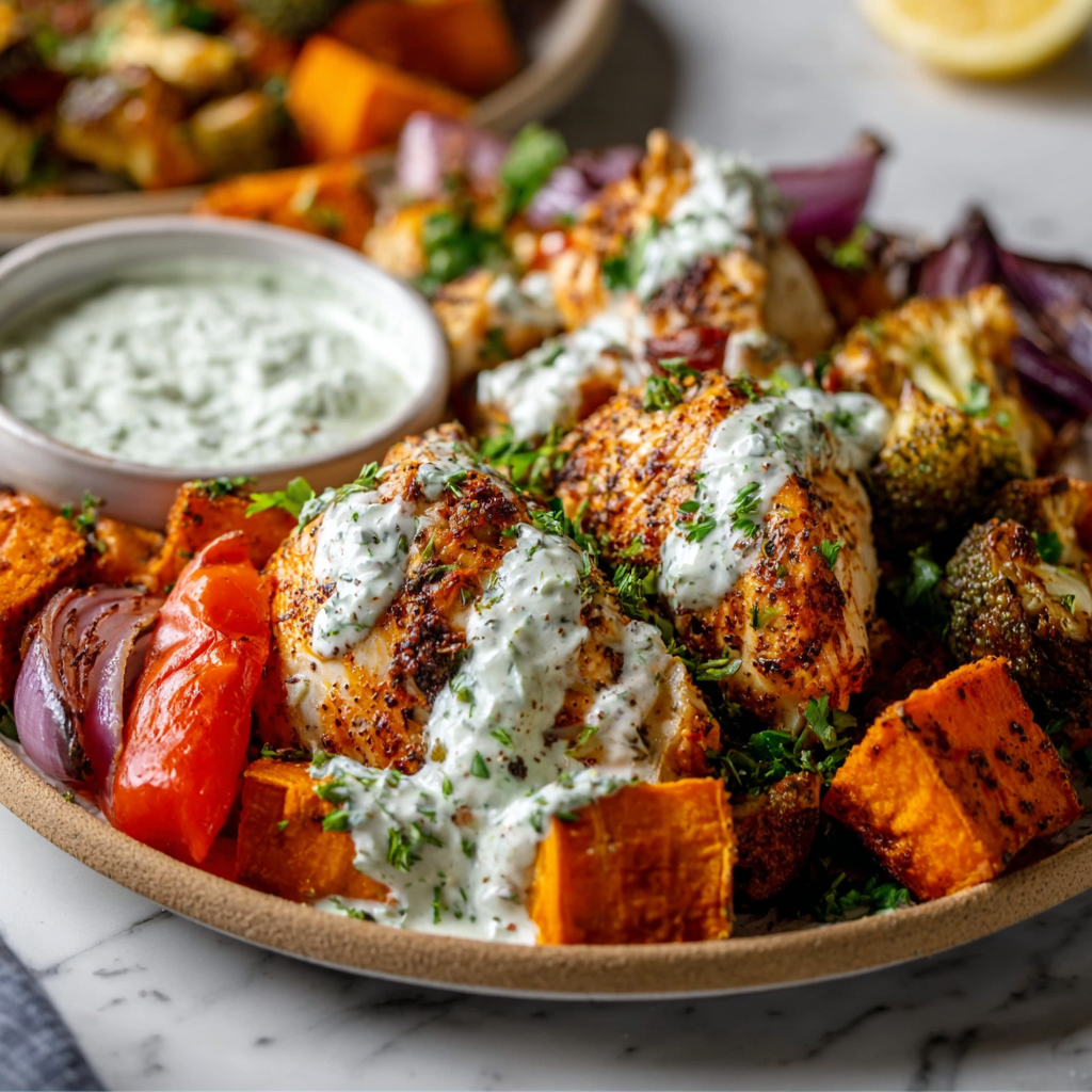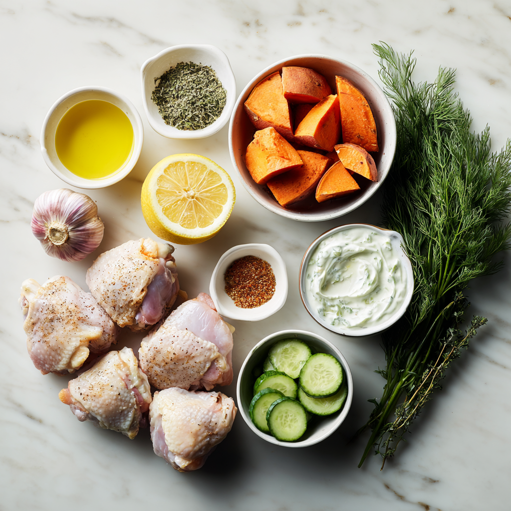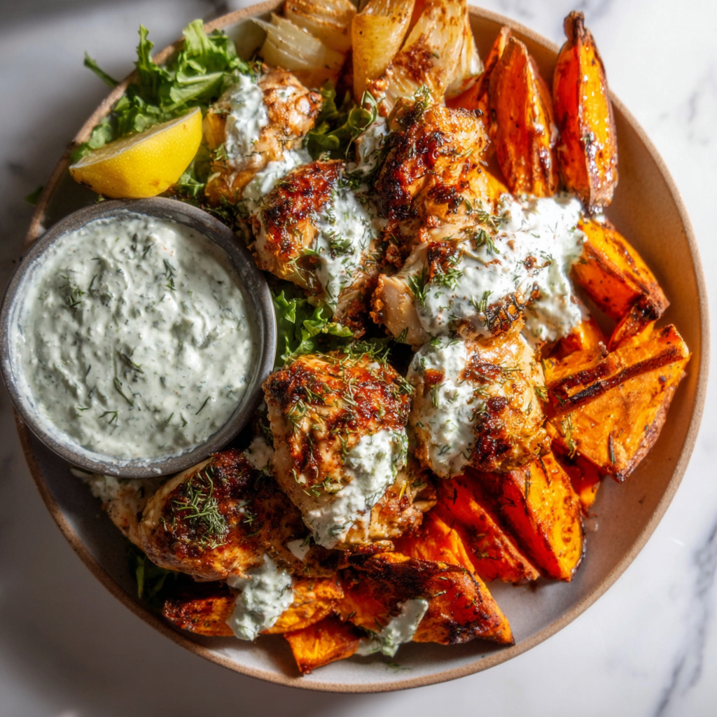 Tzatziki is a classic Greek sauce, traditionally made with yogurt, cucumber, garlic, and fresh herbs. It’s often served as a dip, side, or topping for grilled meats. Combining it with roasted chicken and sweet potatoes creates a delicious fusion of Mediterranean flavors with the comfort of roasted vegetables, perfect for a wholesome, weeknight-friendly meal.