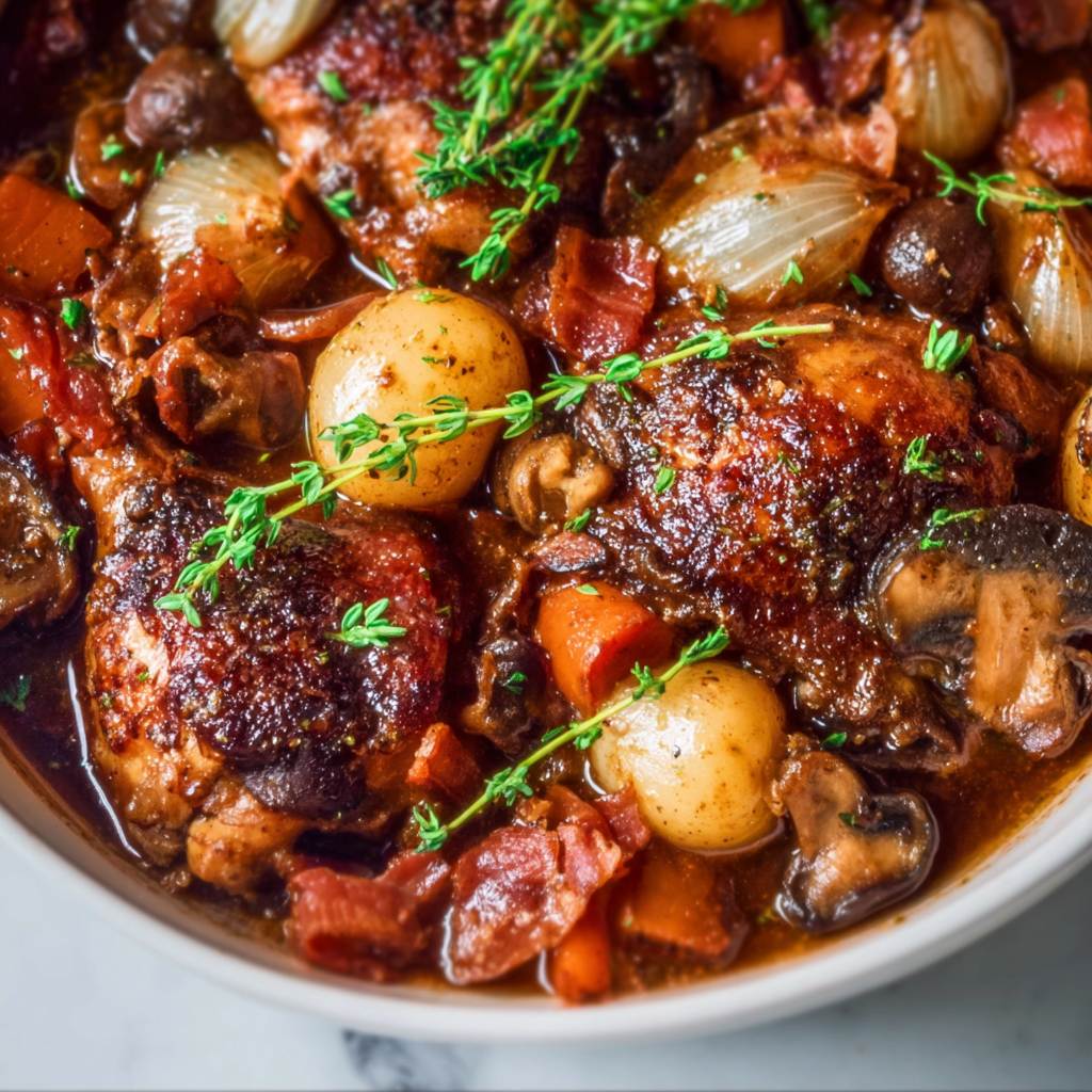 The beauty of coq au vin lies in its balance: savory, earthy, slightly sweet, and deeply aromatic. The wine reduces into a silky sauce, the bacon adds smokiness, and the herbs tie everything together.