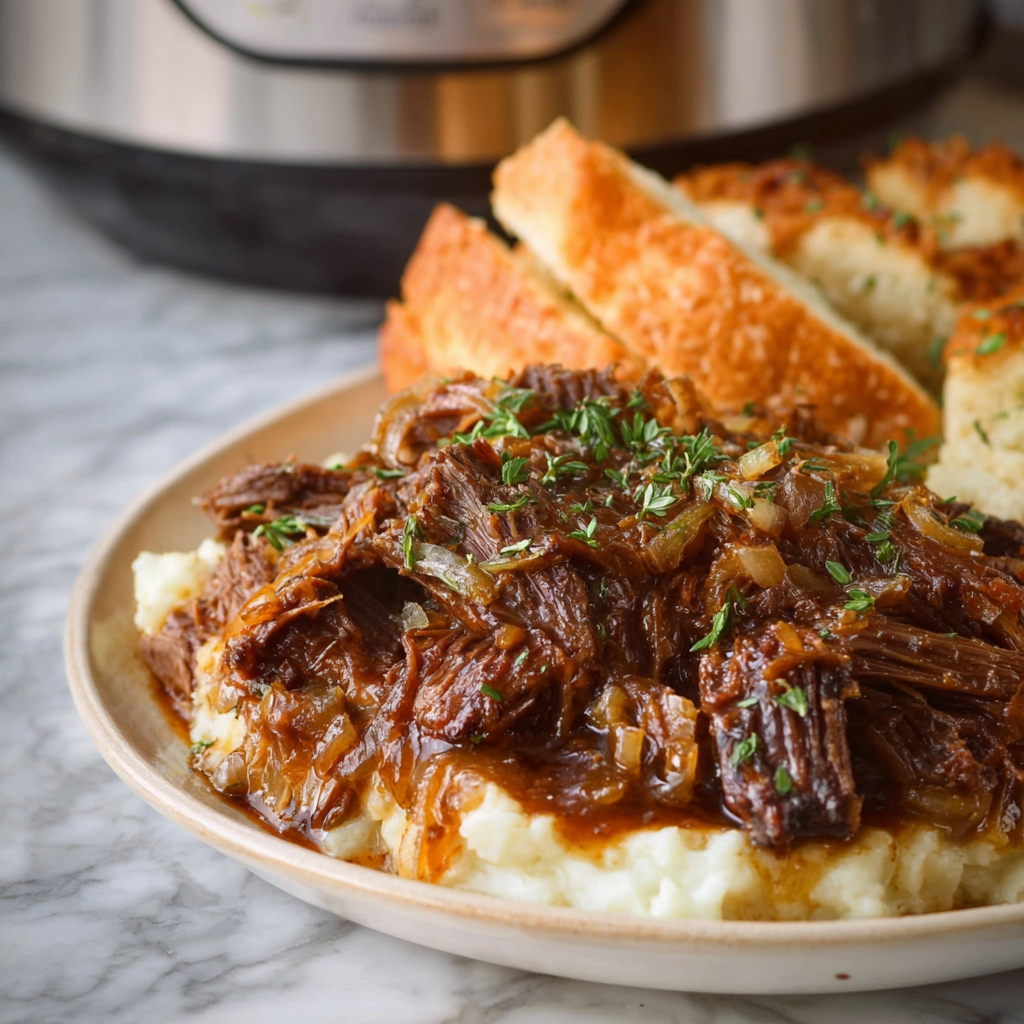 Unlike traditional pot roast that relies heavily on vegetables, this version puts onions front and center, letting them break down into a naturally thick, flavorful sauce that coats every bite of beef.