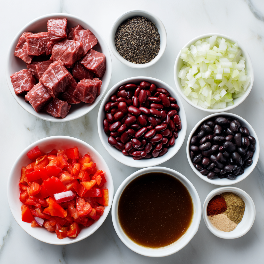 - Layer Ingredients in Slow Cooker: Add steak, onions, garlic, bell peppers, diced tomatoes, kidney beans, black beans, beef broth, tomato paste, and all spices. Stir to combine.
