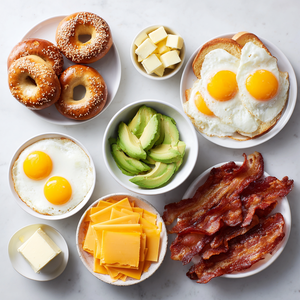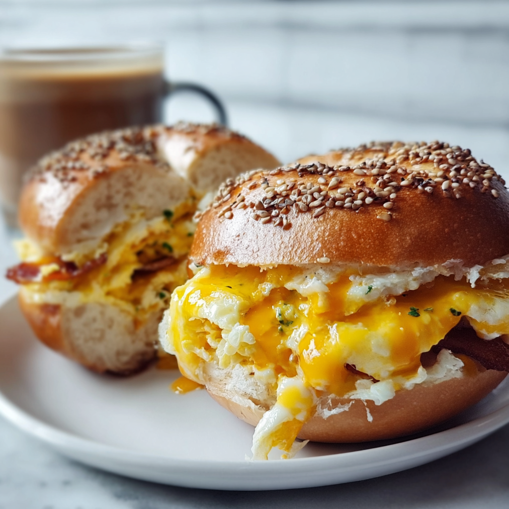 A hearty breakfast sandwich made with toasted bagels, fluffy eggs, melted cheese, and crispy bacon.