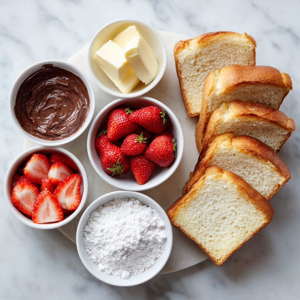 Brioche bread, known for its rich, buttery crumb and tender texture, serves as the perfect base. When toasted until golden, it becomes crisp on the outside while remaining soft and pillowy inside. Add a generous layer of creamy chocolate hazelnut spread, fresh juicy strawberries, and a light dusting of powdered sugar, and you have a dish that looks luxurious but comes together in minutes.