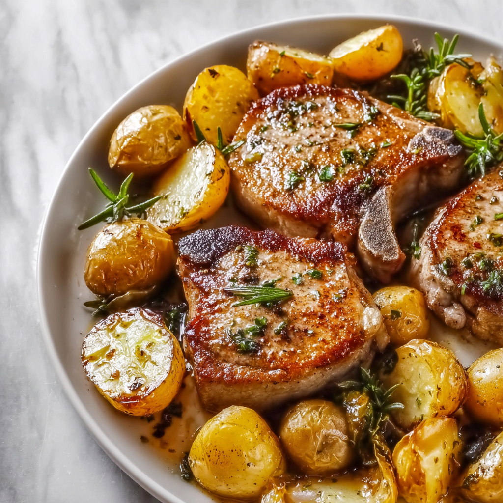 Juicy pork chops roasted with crispy potatoes and onions for an easy one-pan dinner.
