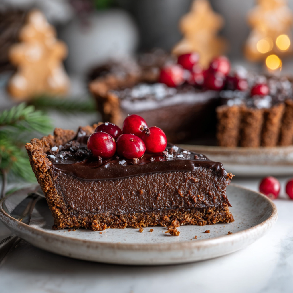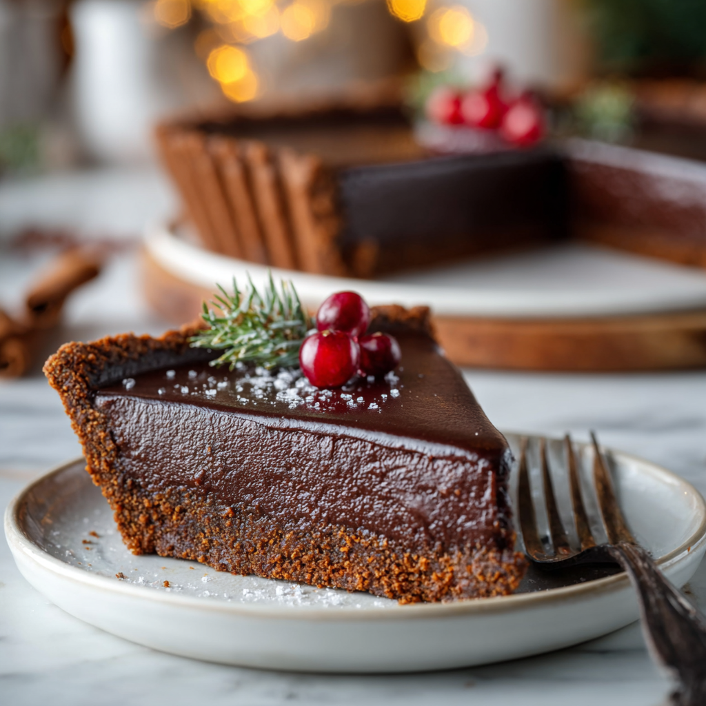 A festive spiced gingerbread crust filled with silky dark chocolate ganache – the ultimate holiday dessert.