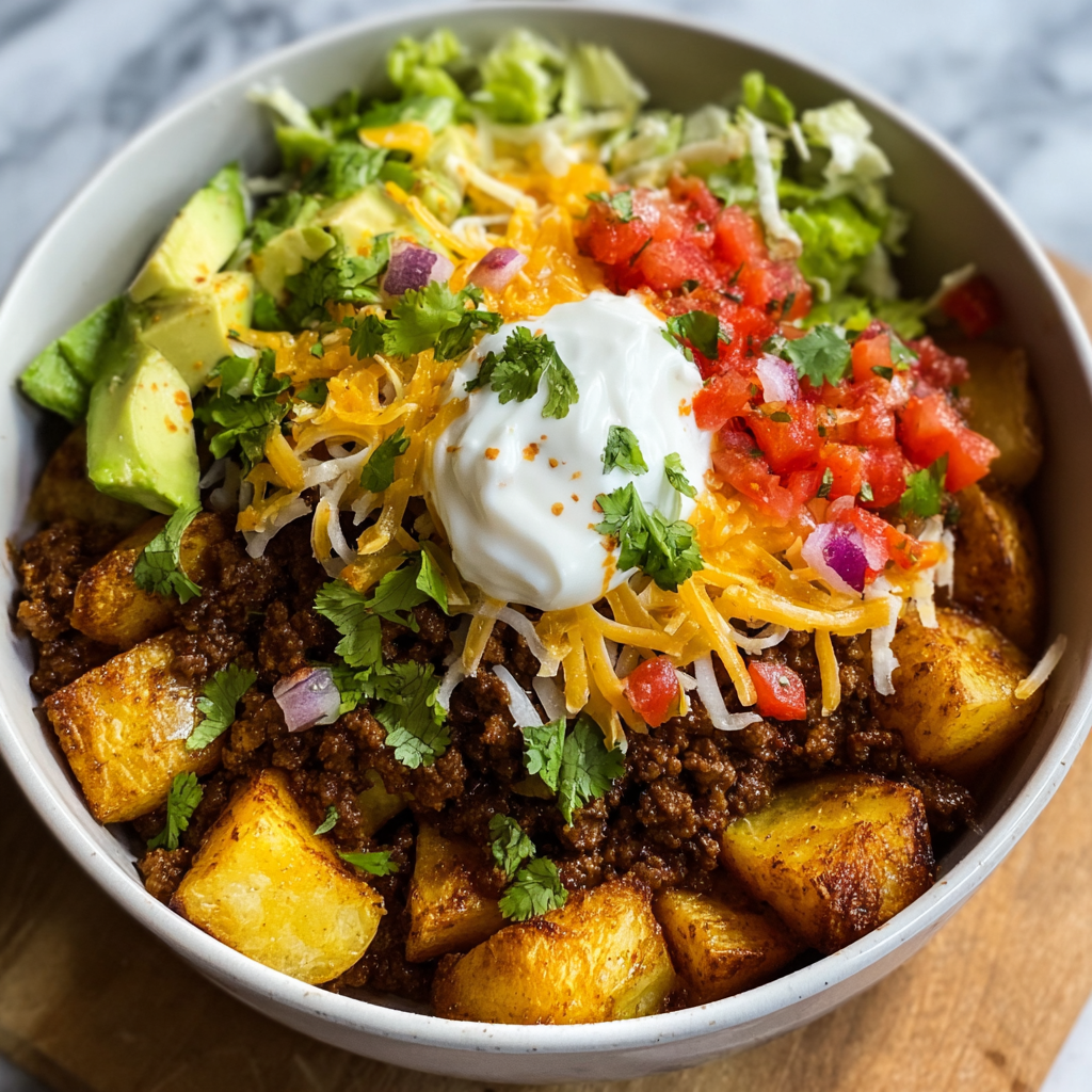 Taco bowls have exploded in popularity because they’re versatile, nutritious, and fun to eat. Adding potatoes elevates the game: roasted until crispy on the outside and tender inside, they provide a sturdy, flavorful foundation that soaks up the juices from the seasoned beef without getting soggy.