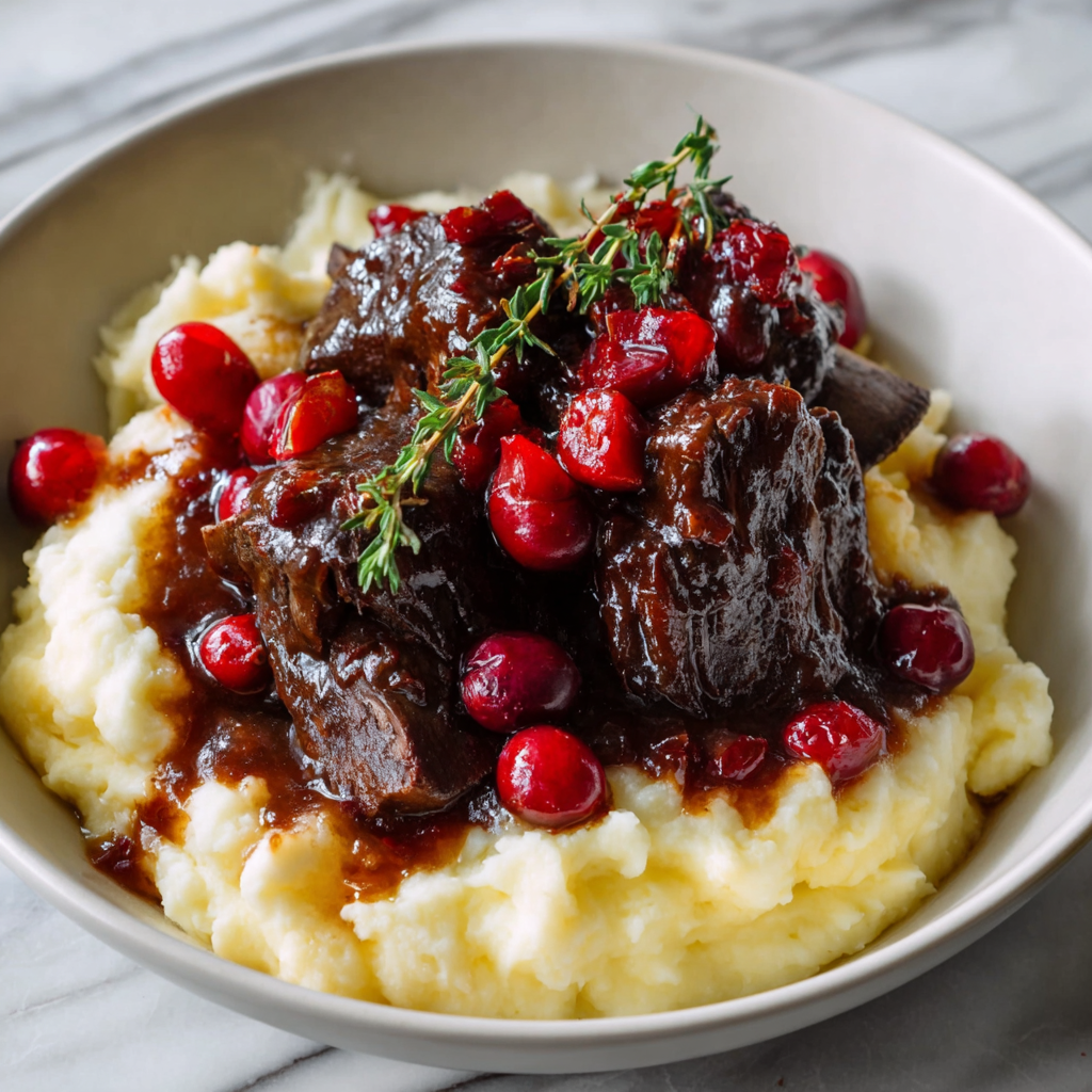 This cranberry short ribs recipe combines the classic comfort of braised beef with bright, seasonal cranberries for a modern twist on traditional holiday meals. The sauce balances the richness of the ribs with tart cranberries, red wine, and aromatic herbs, while the creamy mash soaks up every drop. It’s elegant enough for guests but simple enough for family dinners—most of the work happens hands-off in the oven or slow cooker.