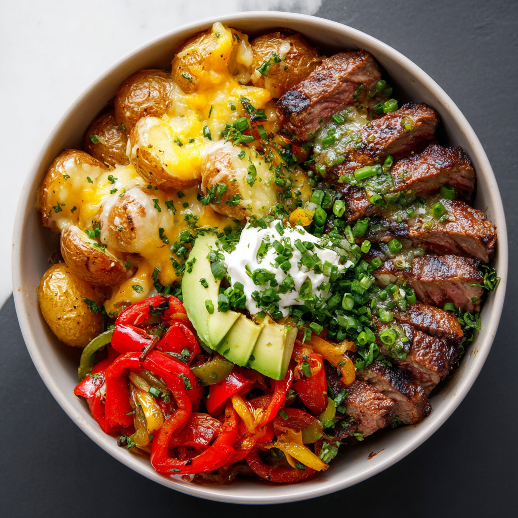 Craving a hearty, satisfying meal that’s packed with protein, veggies, and flavor? These loaded steak & potato power bowls are your new go-to for lunch, dinner, or post-workout fuel. Tender strips of perfectly seasoned steak sit atop crispy roasted potatoes, layered with colorful sautéed peppers and onions, melted sharp cheddar, creamy avocado, and a cool dollop of sour cream. Every bite delivers steakhouse vibes with the convenience of a one-bowl meal.