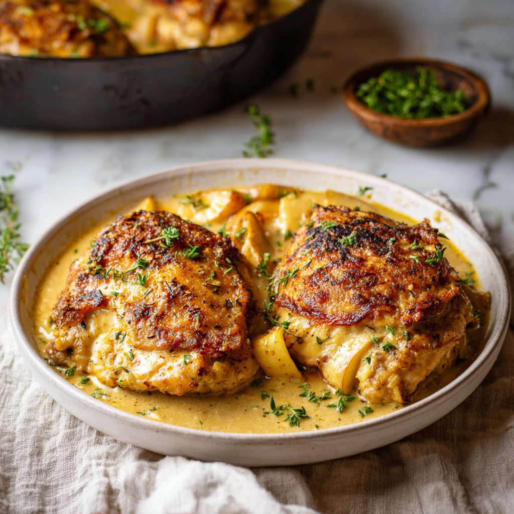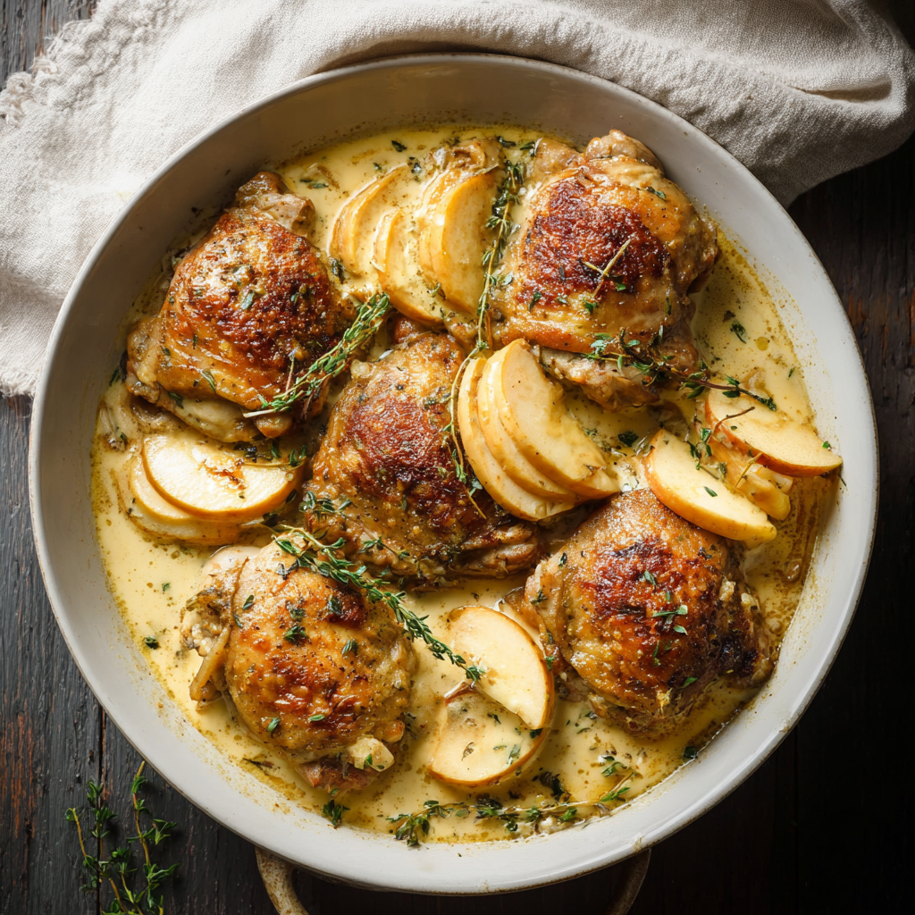Tender chicken thighs simmered in a rich, creamy apple cider sauce with fresh apples and thyme – an easy one-pan fall favorite.