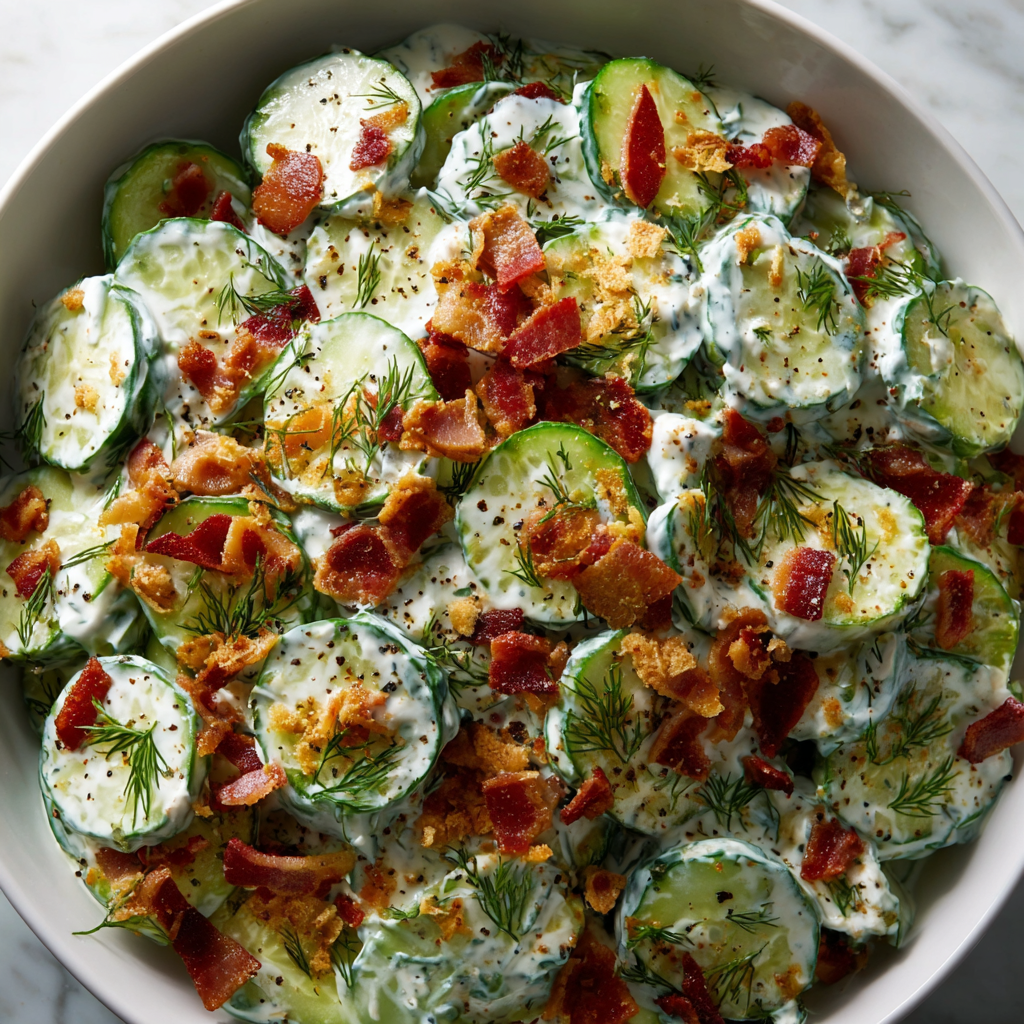 Classic cucumber salad is loved for its crisp texture and cooling effect. By adding bacon and a richer dressing, this version becomes something special—still refreshing, but undeniably indulgent.