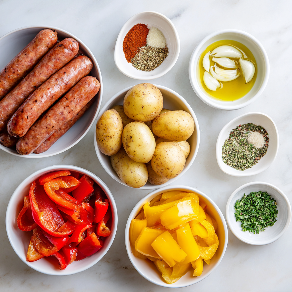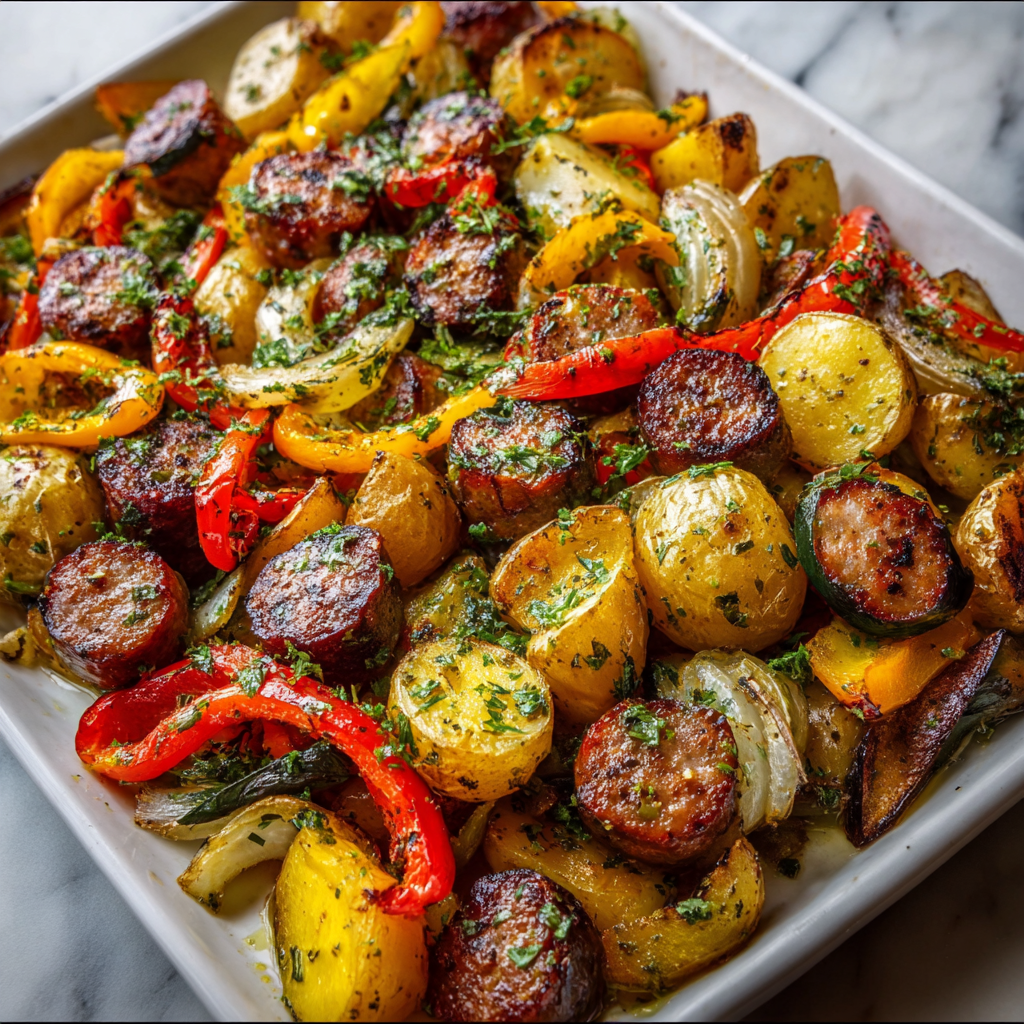 This recipe brings together juicy sausage, crispy roasted potatoes, and caramelized vegetables, all cooked together on a single sheet pan. The oven does most of the work, while the flavors deepen and intensify as everything roasts together. It’s cozy, hearty, and endlessly adaptable — a true staple for busy weeknights, chilly evenings, or whenever you want something reliable and delicious.