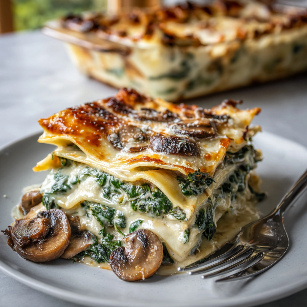 Unlike watery vegetable lasagnas, this recipe focuses on moisture control — sautéing mushrooms thoroughly and wilting spinach properly ensures a perfectly set, sliceable lasagna every time.