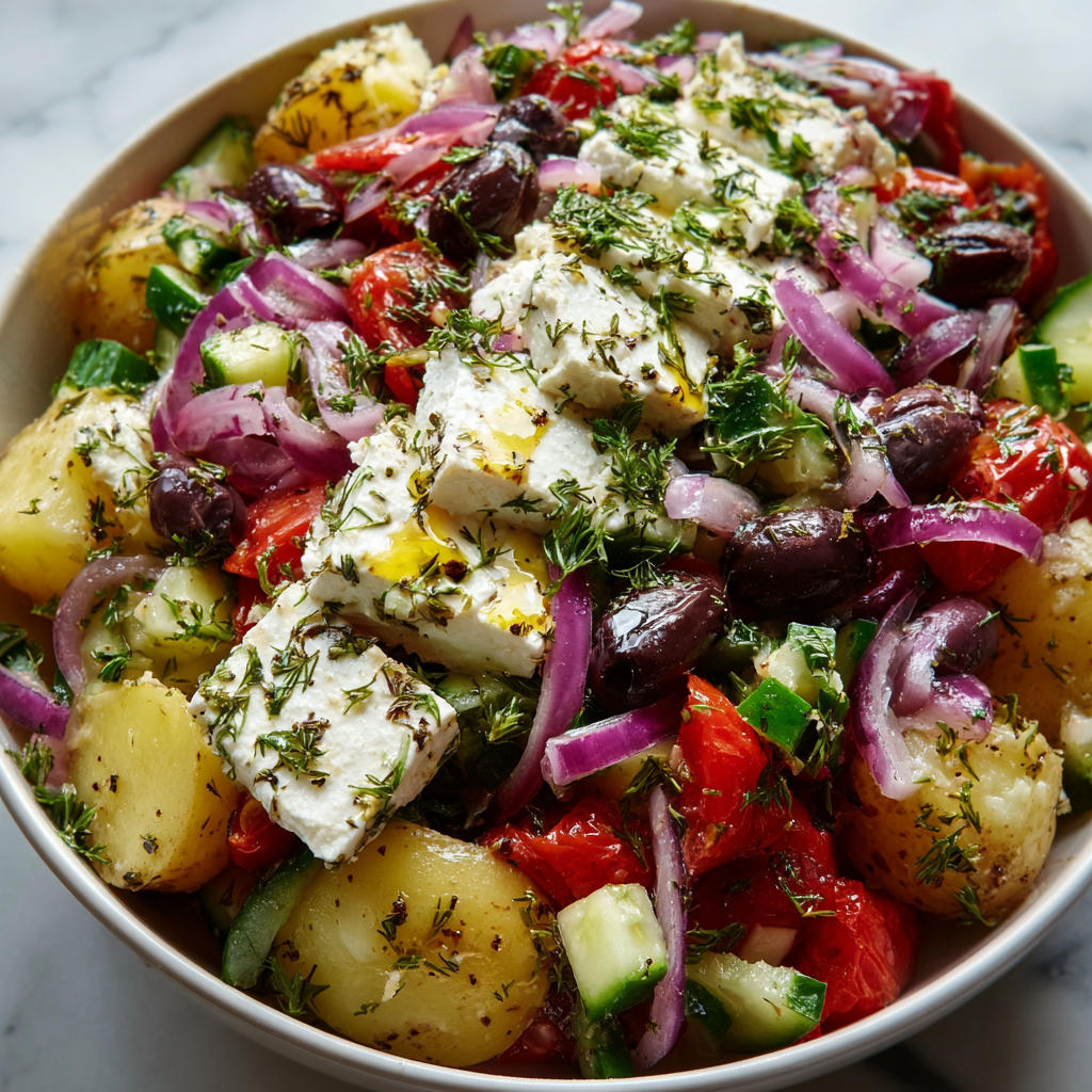 Use high-quality extra virgin olive oil and real Greek feta in brine for authentic flavor — it makes a huge difference. Don’t overcook the potatoes; they should hold their shape. For a lighter version, reduce mayo and increase yogurt. Soak sliced red onions in cold water for 10 minutes to mellow their sharpness.