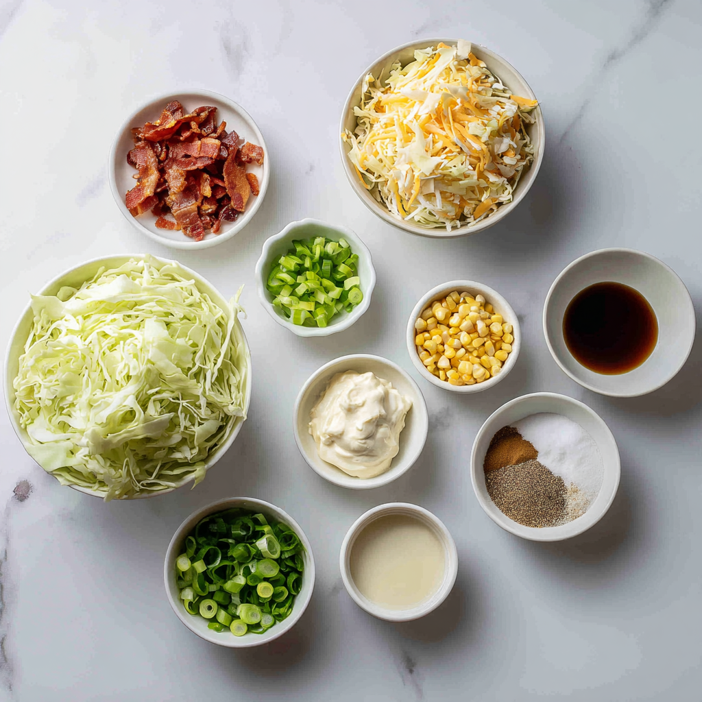 - In a large bowl, combine shredded cabbage, corn, bacon, and green onions.