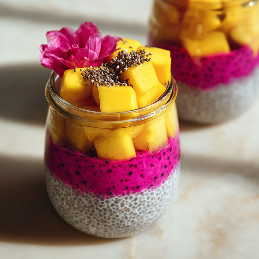 A vibrant tropical chia pudding layered with mango and dragon fruit for a refreshing, healthy meal or snack.