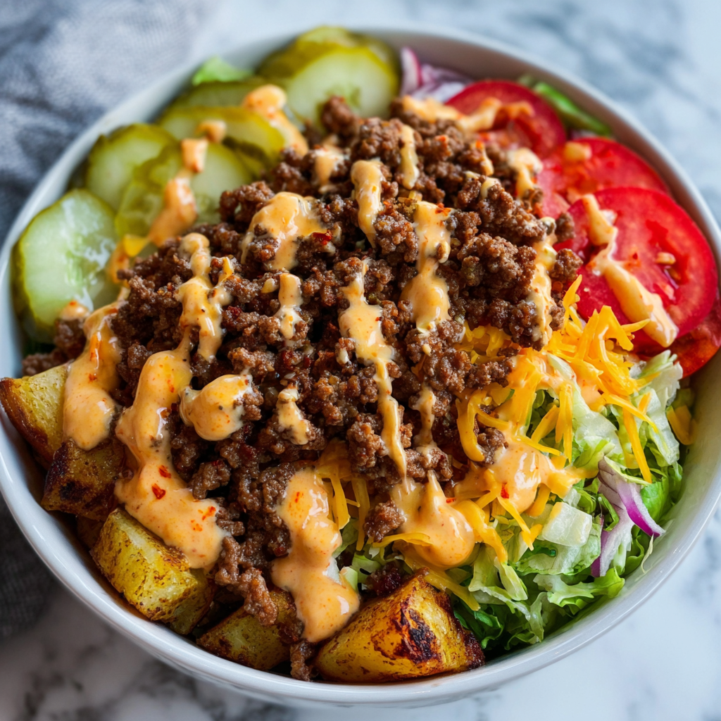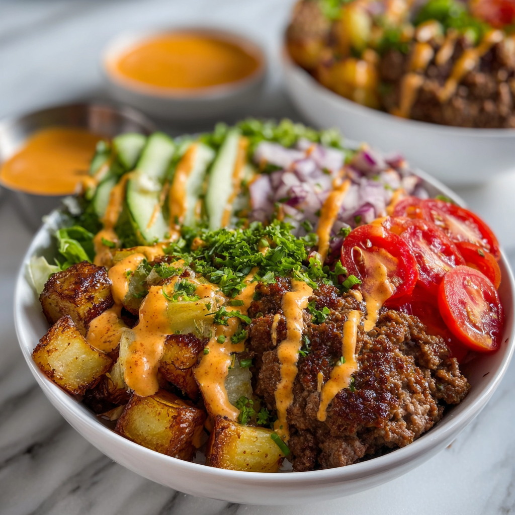 This isn’t just a deconstructed burger — it’s a carefully balanced bowl designed for maximum flavor in every bite. The special sauce ties everything together with creamy, tangy richness that tastes just like your favorite burger joint’s secret recipe.