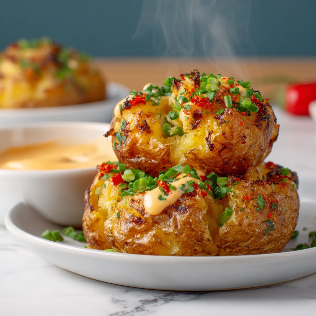 Patatas explosivas are the louder, bolder cousin of classic patatas bravas. They take humble potatoes and turn them into crackly, smashed, oven-roasted bites that explode with flavor thanks to a creamy, spicy sauce drizzled over the top. Crunchy on the outside, fluffy in the center, and unapologetically saucy, this dish delivers maximum impact with minimal ingredients.