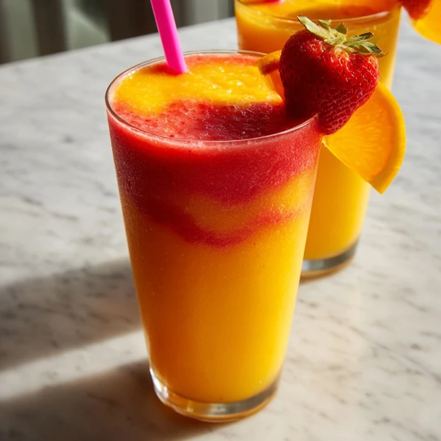 The magic of the Sunrise Sunset smoothie comes from its layered fruit flavors. Strawberries provide sweetness and a beautiful red hue, while mango and pineapple add tropical depth. Orange juice ties everything together with a bright citrus finish that keeps the smoothie refreshing rather than heavy.