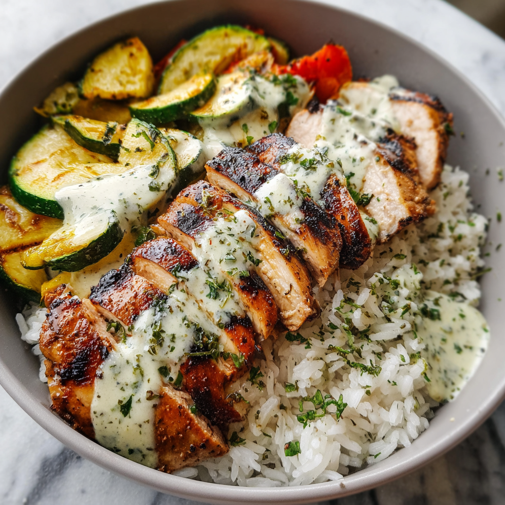 Grilling the chicken adds depth and smoky flavor without extra fat. Herbs bring freshness and aroma. The creamy sauce adds comfort and richness, while grains and vegetables provide texture and nutrition. It is a complete meal in one bowl that satisfies multiple cravings at once.