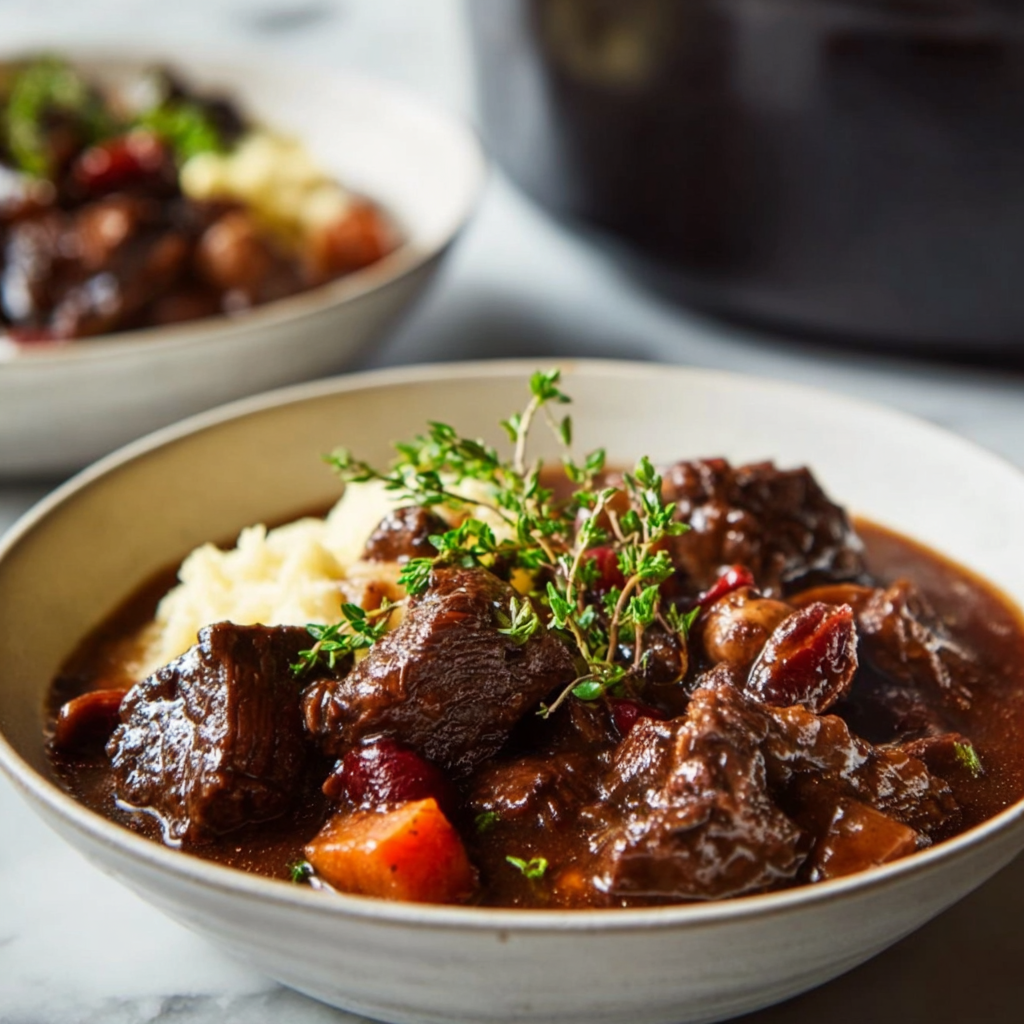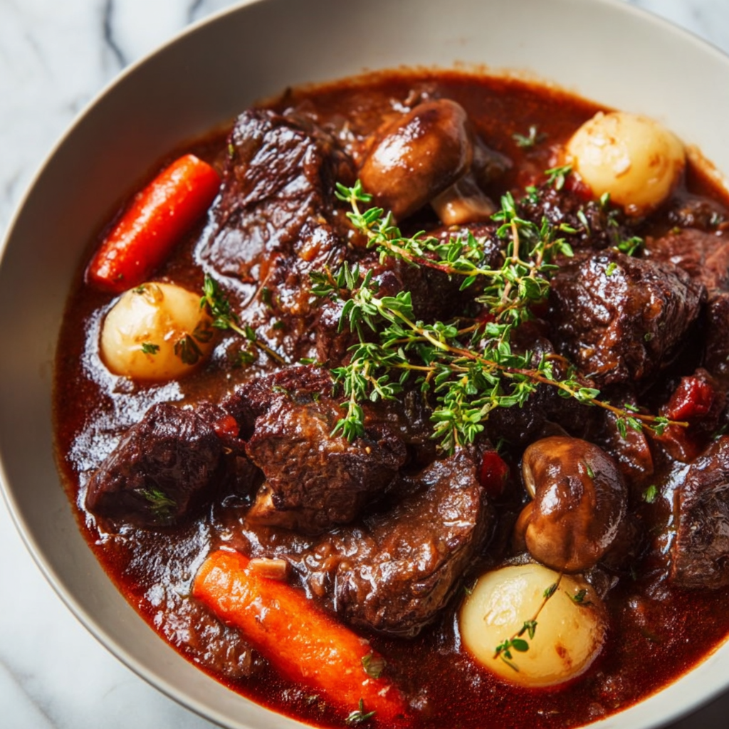 This dish is not simply beef stew with wine added. It is a carefully layered composition of flavors, textures, and aromas. Bacon provides depth, wine adds structure, herbs bring balance, and slow cooking transforms tough beef into something profoundly elegant.