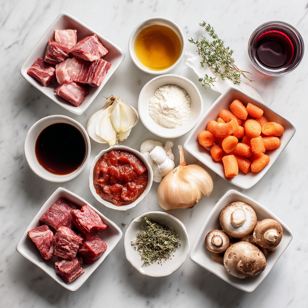 Each ingredient is intentional. Beef chuck contains connective tissue that breaks down beautifully during slow cooking. Burgundy wine provides acidity and depth. Bacon adds umami. Herbs bring restraint and elegance.