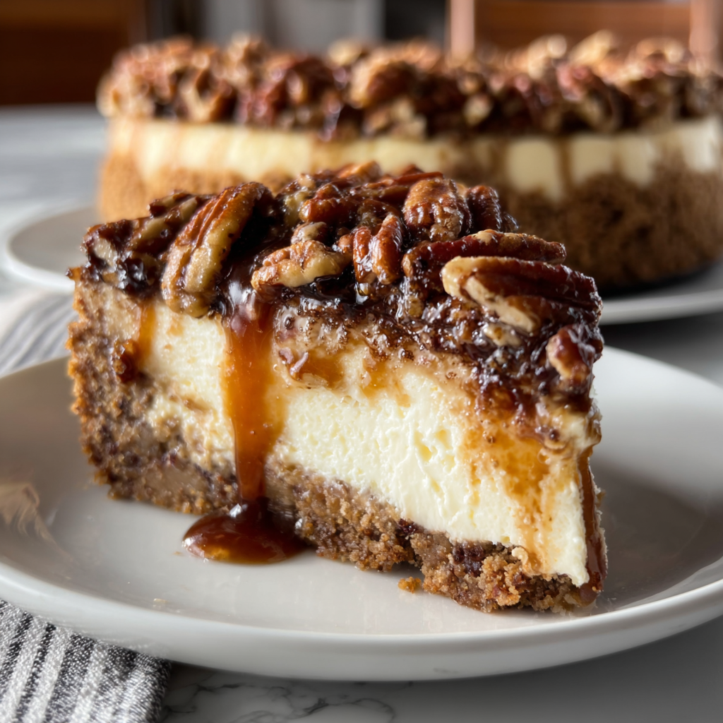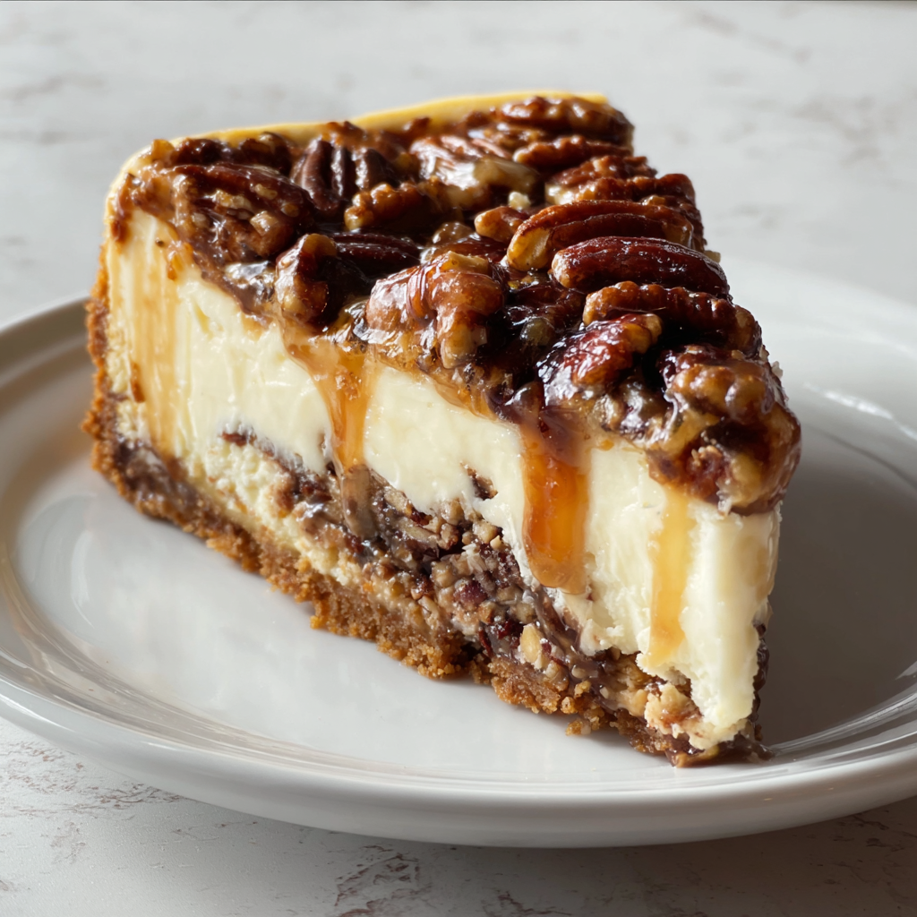 The cheesecake layer adds tang and creaminess that balances the sweetness of the pecan topping. The pecan layer brings crunch and warmth, preventing the dessert from feeling too heavy. The crust grounds everything with buttery crispness.