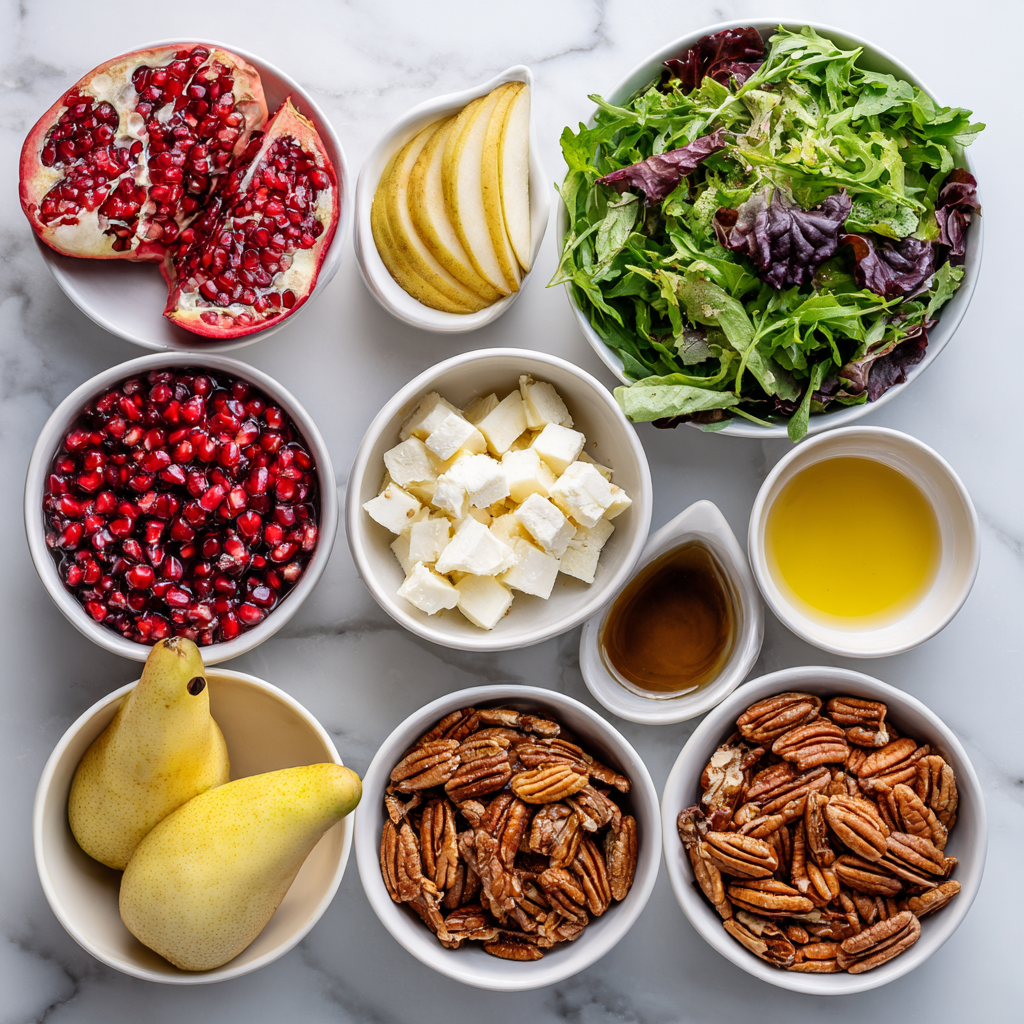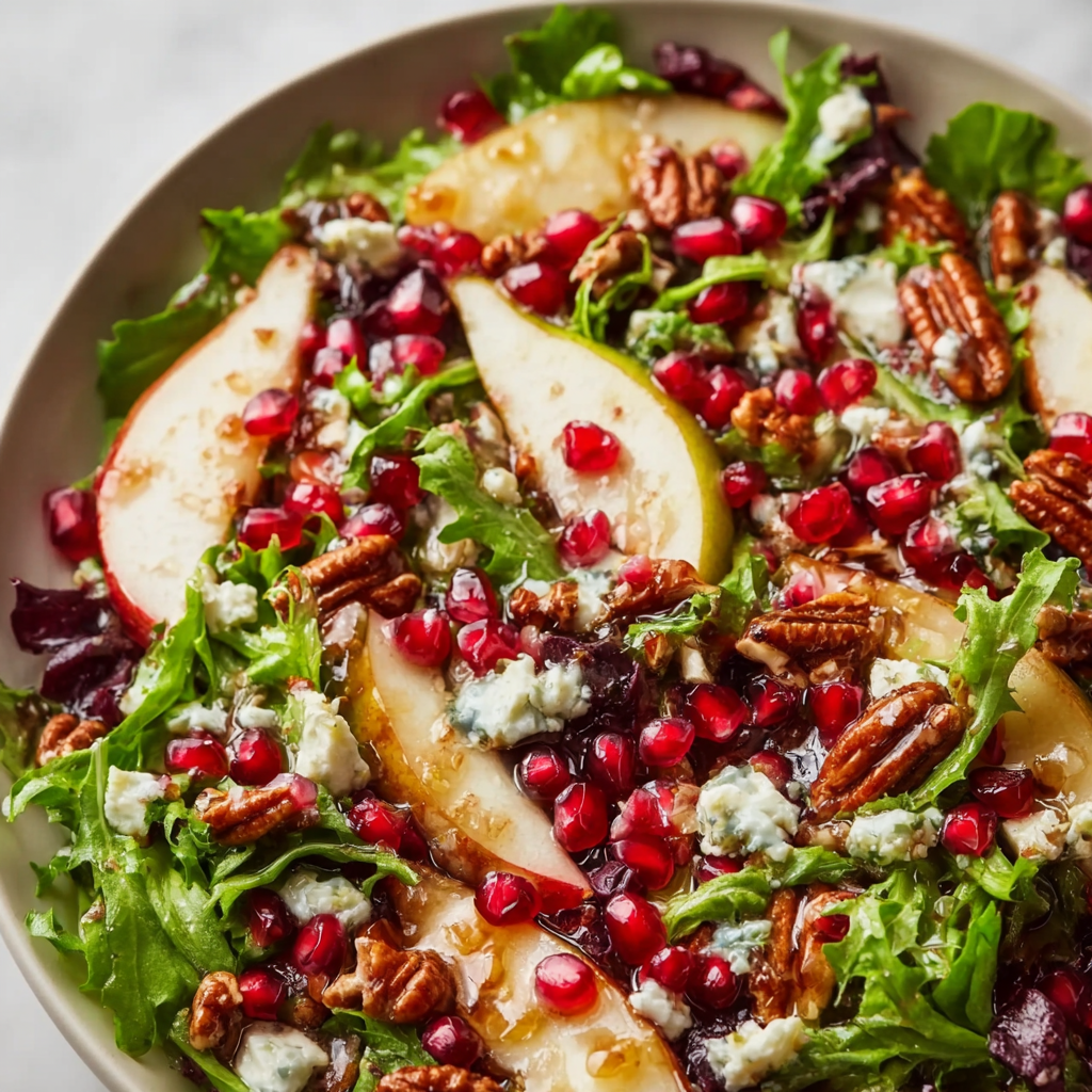 Bright ruby pomegranate seeds glisten like holiday ornaments, crisp greens provide a refreshing base, and sweet pears mingle with crunchy toasted nuts and creamy cheese. Everything is tied together with a silky honey mustard dressing that’s tangy, slightly sweet, and irresistibly smooth. It’s a salad that feels celebratory yet comforting, light yet satisfying, and simple yet impressive.