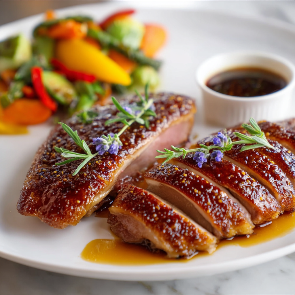 Crispy pan-seared duck breast finished with a delicate lavender-infused honey glaze, perfect for an elegant main course.