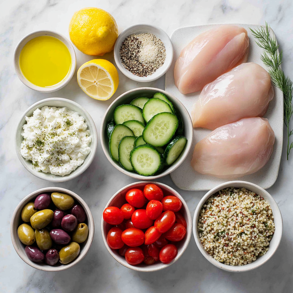 - Top each bowl with cooked chicken, cucumbers, tomatoes, olives, and crumbled feta.