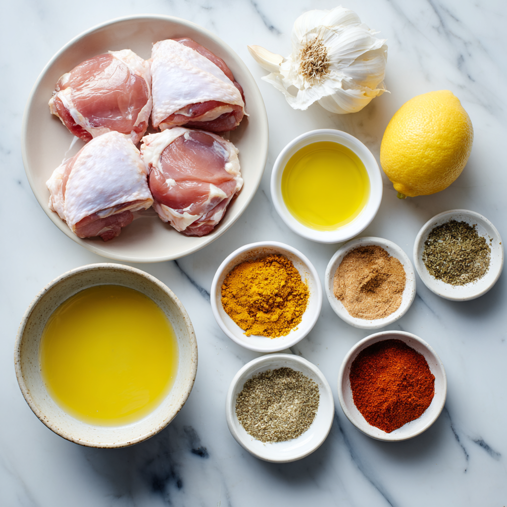 In a large bowl, whisk together yogurt, olive oil, lemon juice, garlic, cumin, paprika, coriander, turmeric, cinnamon, salt, and black pepper until smooth.