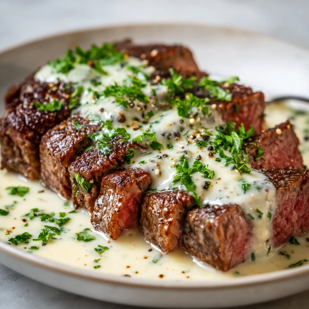 Tender pan-seared steak finished with a rich, restaurant-style creamy garlic sauce made entirely at home.
