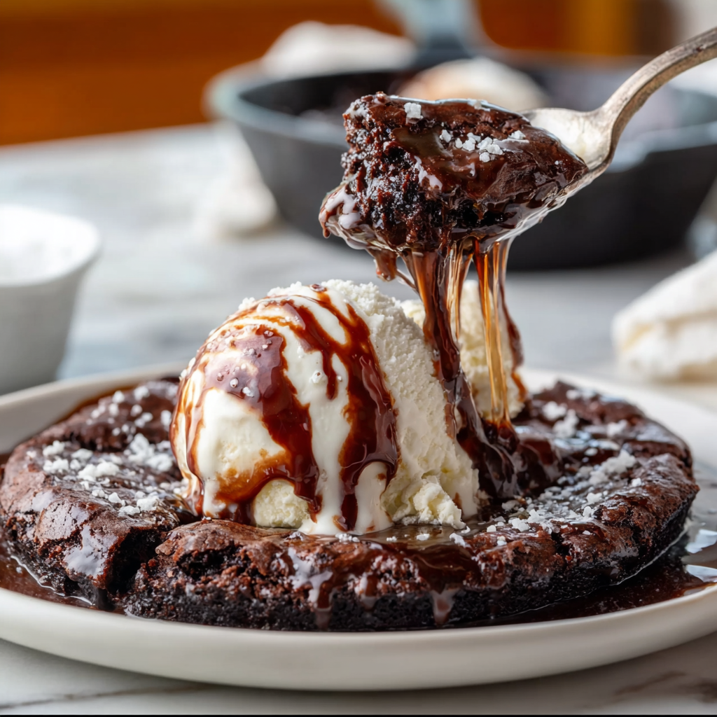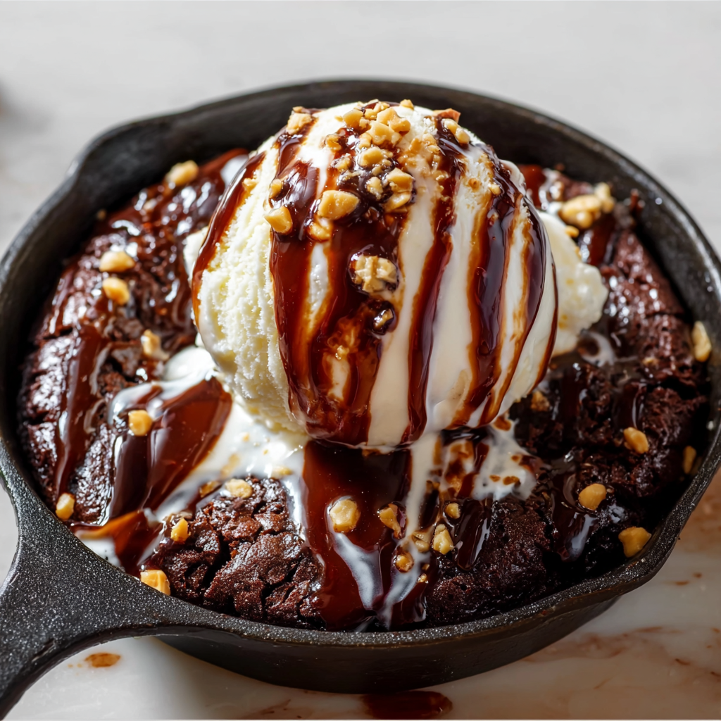 This is not a dry brownie or a neat, perfectly sliced square. This is a deeply gooey, spoonable brownie, baked in a skillet so the edges turn slightly crisp while the center stays molten and soft. Add a scoop of vanilla ice cream, watch it melt into the chocolate, and you have a dessert that feels restaurant-worthy but is incredibly easy to make at home.