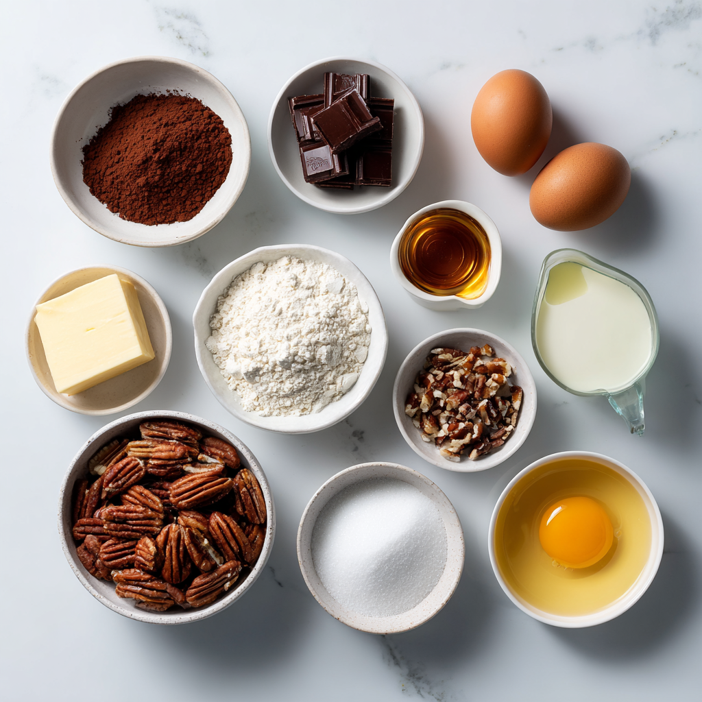 Each ingredient is intentional. Dark chocolate deepens the brownie flavor, while cocoa powder reinforces richness. Brown sugar appears in both layers to create cohesion, and vanilla ties everything together. Pecans should be fresh and lightly toasted for maximum flavor.