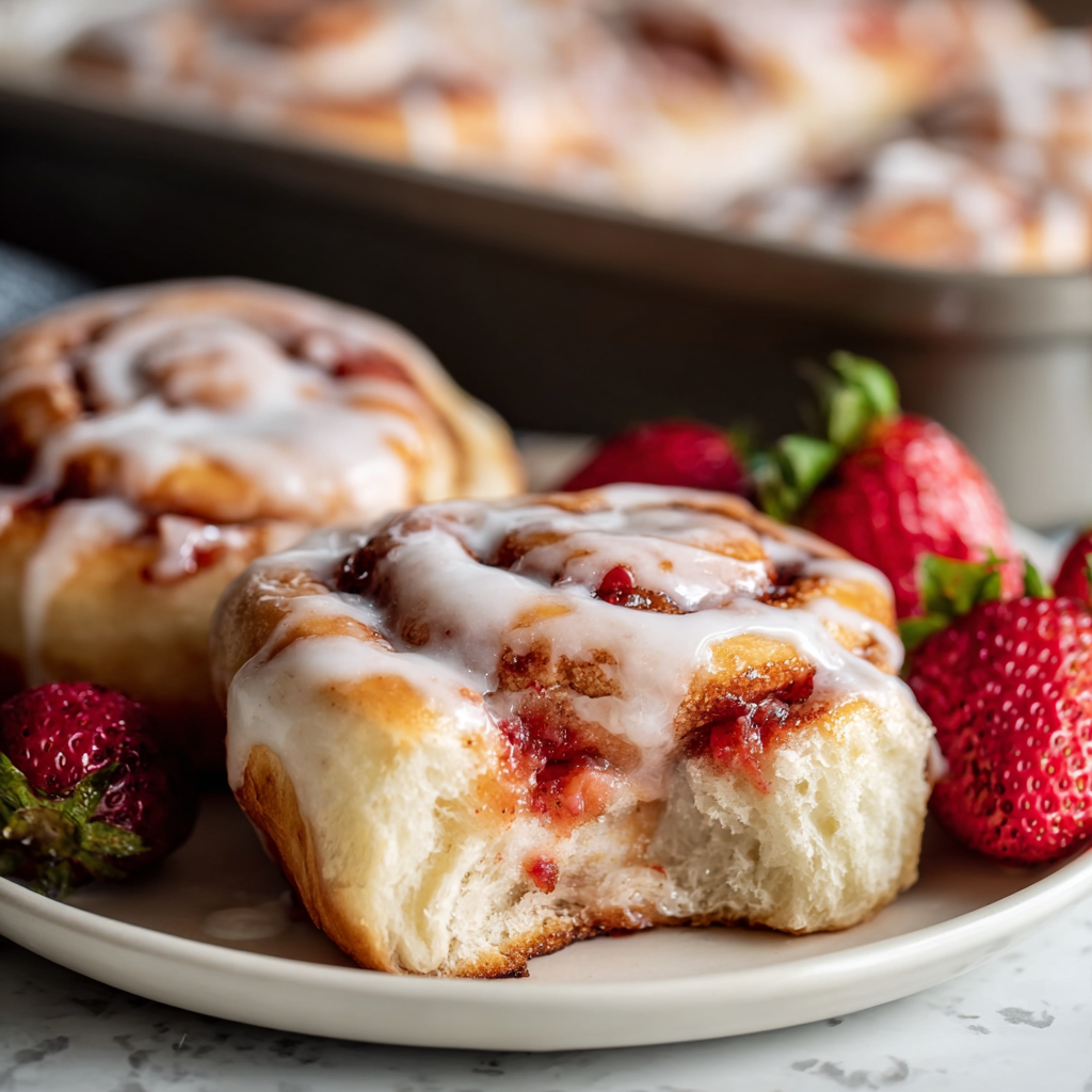 Soft, pillowy cinnamon rolls filled with sweet strawberries and topped with cream cheese glaze.