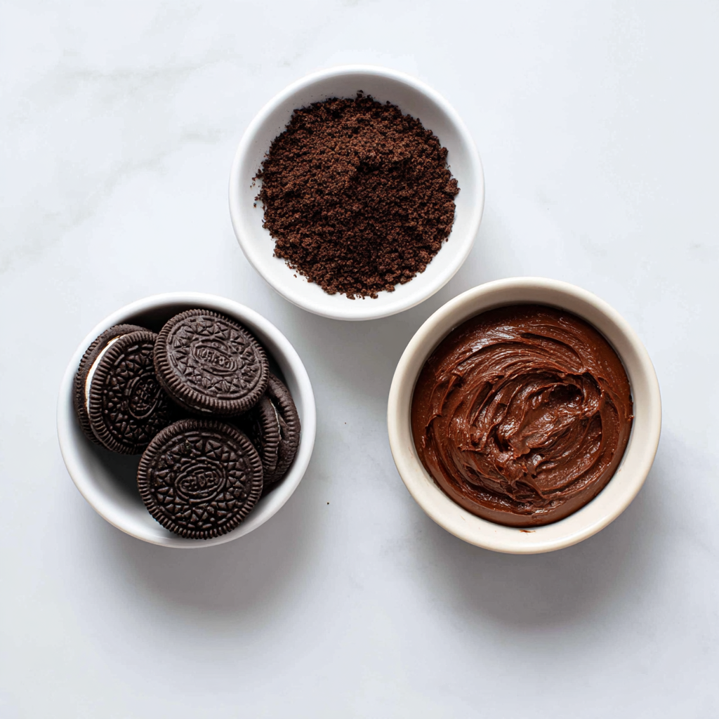 Chocolate sandwich cookies work best because they already contain cocoa, sugar, and fat in ideal proportions. When crushed, they form a fine crumb that binds easily with the chocolate spread.
