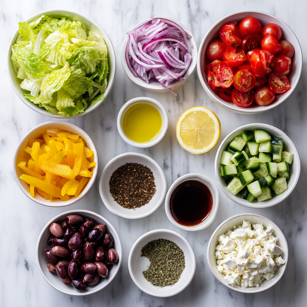 - Combine chopped romaine, tomatoes, cucumber, bell peppers, red onion, and olives in a large bowl.